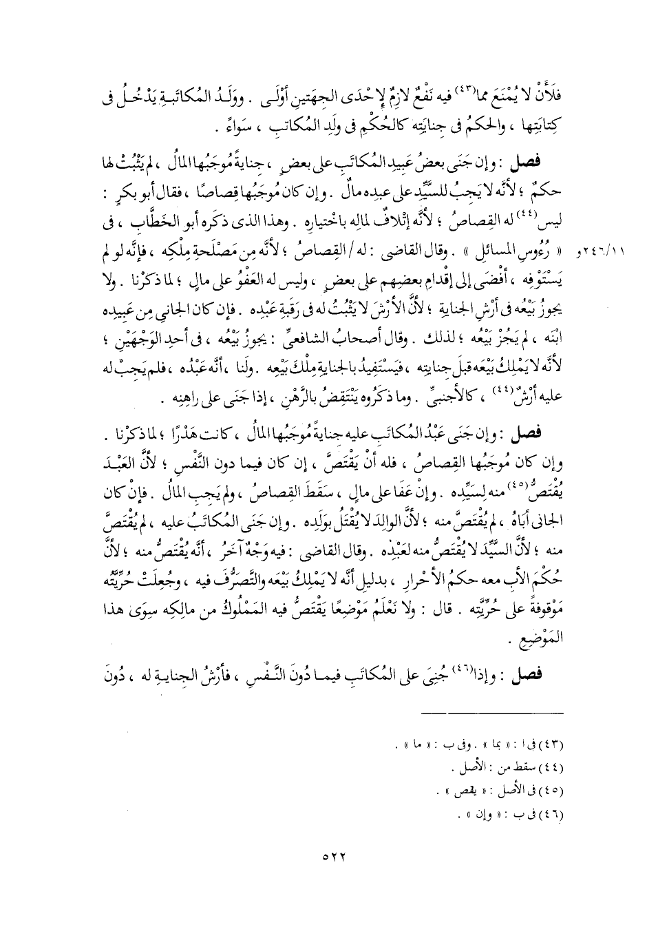 فصل: وإذا (٤٦) جُنِىَ على المُكاتَبِ فيما دُونَ النَّفْسِ، فأرْشُ الجِنايةِ له، دُونَ