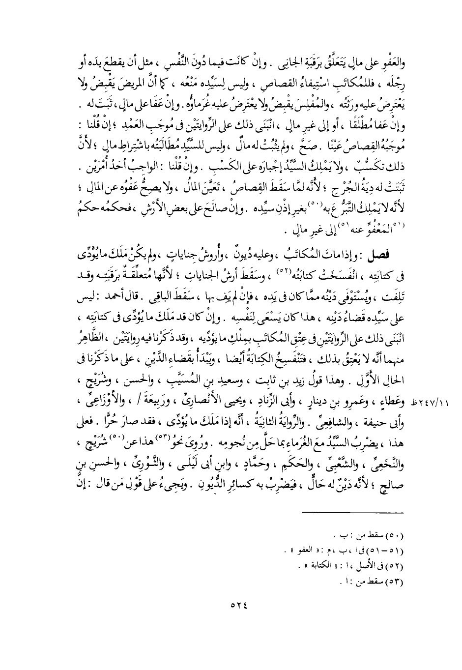 والعَفْوِ على مالٍ يَتَعَلَّقُ برَقَبَةِ الجانِى. وإنْ كانَت فيما دُونَ النَّفْسِ، مثل أن يقطعَ يدَه أو رِجْلَه، فللمُكاتَبِ اسْتِيفاءُ القصاصِ، وليس لِسَيِّدِه مَنْعُه، كما أَنَّ المريضَ يَقبِضُ ولا يَعْتَرِضُ عليه رَثَتُه، والمُفلِسَ يقْبِضُ ولا يعْتَرِضُ عليه غُرَماؤُه. وإِنْ عَفَا على مالٍ، ثَبَتَ له. وإِنْ عَفا مُطْلَقًا، أو إلى غيرِ مالٍ، انْبَنَى ذلك على الرِّوايتَيْن فى مُوجَبِ العَمْدِ؛ إِنْ قُلْنا: مُوجَبُهُ القِصاصُ عَيْنًا. صَحَّ، ولم يثْبُتْ له مالٌ، وليس للسَّيِّدِ مُطَالَبَتُه باشْتِراطِ مالٍ؛ لأنَّ ذلك تكَسُّبٌ، ولا يَمْلِكُ السَّيِّدُ إجْبارَه على الكَسْبِ. وإِنْ قُلْنا: الواجِبُ أحَدُ أَمْرَيْن. ثبَتَتْ له دِيَةُ الجُرْحِ؛ لأَنَّه لمَّا سَقَطَ القِصاصُ، تَعَيَّنَ المالُ، ولا يصِحُّ عَفْوُه عن المالِ؛ لأَنَّه لا يَمْلِك التَّبَرُّعَ به (٥٠) بغيرِ إذْنِ سيِّدِه. وإِنْ صالَحَ على بعضِ الأرْشِ، فحكمُه حكمُ [المَعْفُوِّ عنه] (٥١) إلى غيرِ مالٍ.