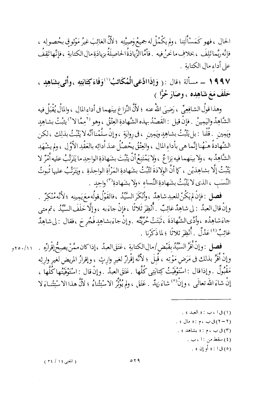 ١٩٩٧ - مسألة؛ قال: (وَإِذَا ادَّعَى الْمُكَاتَبُ (١) وَفَاءَ كِتَابَتِهِ، وأَتَى بِشَاهِدٍ، خَلَفَ مَعَ شَاهِدِه، وصَارَ حُرًّا)