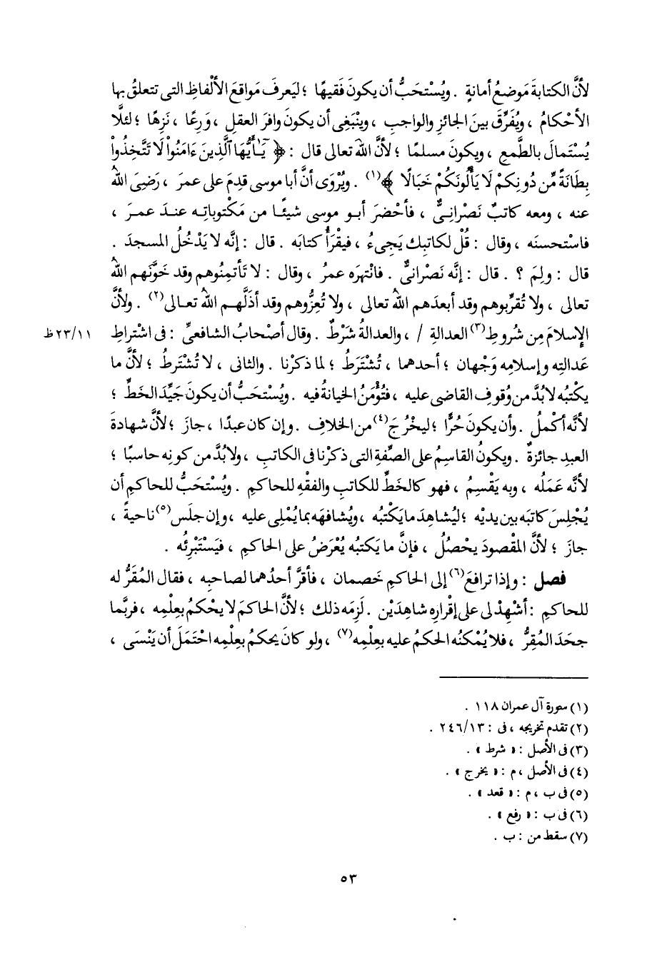 لأنَّ الكتابةَ مَوضعُ أمانةٍ. ويُسْتحَبُّ أن يكونَ فَقيهًا، ليَعرفَ مَواقعَ الألْفاظِ التى تتعلقُ بها الأحْكامُ، ويُفرِّقَ بينَ الجائزِ والواجبِ، وينْبَغِى أن يكونَ وافرَ العقلِ، وَرِعًا، نَزِهًا؛ لئلَّا يُسْتَمالَ بالطَّمعِ، ويكونَ مسلمًا؛ لأنَّ اللهَ تعالى قال: {يَاأَيُّهَا الَّذِينَ آمَنُوا لَا تَتَّخِذُوا بِطَانَةً مِنْ دُونِكُمْ لَا يَأْلُونَكُمْ خَبَالًا} (١). ويُرْوَى أنَّ أبا موسى قدِمَ على عمرَ، رَضِىَ اللهُ عنه، ومعه كاتبٌ نَصْرانِيٌّ، فأحْضرَ أبو موسى شيئًا من مَكْتوباتِه عندَ عمرَ، فاسْتحسنَه، وقال: قُلْ لكاتبِك يَجِىءُ، فيقْرَأُ كتابَه. قال: إنَّه لا يَدْخُلُ المسجدَ. قال: ولِمَ؟ . قال: إنَّه نَصْرانيٌّ. فانْتهرَه عمرُ، وقال: لا تَأتمِنُوهم وقد خَوَّنَهم اللهُ تعالى، ولا تُقرِّبوهم وقد أبعدَهم اللهُ تعالى، ولا تُعِزُّوهم وقد أذَلَّهم اللهُ تعالى (٢). ولأنَّ الإِسلامَ مِن شُروطِ (٣) العدالةِ، والعدالةُ شَرْطٌ. وقال أصْحابُ الشافعيِّ: في اشْترِاطِ عَدالتِه وإسلامِه وَجْهان؛ أحدهما، تُشْتَرَطُ؛ لما ذكرْنا. والثاني، لا تُشْتَرطُ؛ لأنَّ ما يكْتبُه لابُدَّ من وُقوفِ القاضى عليه، فتُؤْمَنُ الخيانةُ فيه. ويُسْتحَبُّ أن يكونَ جَيِّدَ الخَطِّ؛ لأنَّه أكْملُ. وأن يكونَ حُرًّا؛ ليخْرُجَ (٤) من الخلافِ. وإن كان عبدًا، جازَ؛ لأنَّ شهادةَ العبدِ جائزةٌ. ويكونُ القاسِمُ على الصِّفةِ التى ذكرْنا في الكاتبِ، ولابُدَّ من كونِه حاسبًا؛ لأنَّه عَمَلُه، وبه يَقْسِمُ، فهو كالخَطِّ للكاتبِ والفقْهِ للحاكمِ. ويُسْتحَبُّ للحاكمِ أن يُجْلِسَ كاتبَه بين يديْه؛ ليُشاهِدَ ما يَكْتبُه، ويُشافهَه بما يُمْلِى عليه، وإن جلَس (٥) ناحيةً، جازَ؛ لأنَّ المقْصودَ يحْصُلُ، فإنَّ ما يَكتبُه يُعْرَضُ على الحاكمِ، فيَسْتَبْرِئُه.