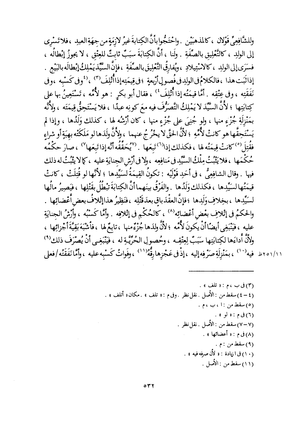 وللشَّافِعِىِّ قَوْلان، كالمذهبَيْن. واحْتَجُّوا بأنَّ الكِتابةَ غيرُ لازِمَةٍ من جِهَةِ العبدِ، فلا تَسْرِى إلى الولدِ، كالتَّعْلِيقِ بالصِّفَةِ. ولَنا، أَنَّ الكِتابَةَ سبَبٌ ثابِتٌ للعِتْقِ، لا يجوزُ إبْطالُه، فسَرَى إلى الولدِ، كالاسْتِيلادِ، ويُفارِقُ التَّعْلِيقَ بالصِّفَةِ، فإِنَّ السَّيِّدَ يَمْلِكُ إبْطالَه بالبَيْعِ. إذا ثَبَت هذا، فالكلامُ فى الولدِ فى فُصولٍ أرْبعةٍ؛ فى قِيمَتِه إذا أُتْلِفَ (٣)، [وفى كَسْبِه، وفى نَفَقَتِه، وفى عِتْقِه. أمَّا قيمَتُه إذا أُتْلِفَ] (٤)، فقال أبو بكرٍ: هو لأُمِّه، تَسْتَعِينُ بها على كِتابَتِها؛ لأَنَّ السَّيِّدَ لا يَمْلِكُ التَّصَرُّفَ فيه معَ كونِه عبدًا، فلا يَسْتَحِقُّ قِيمَتَه، ولأَنَّه بمَنْزِلَةِ جُزْءٍ منها، ولو جُنِىَ على جُزْءٍ منها، كان أرْشُه لها، كذلك وَلَدُها، وإذا لم يَسْتَحِقَّها هو كانتْ لأُمِّهِ؛ لأنَّ الحقَّ لا يخْرُجُ عنهما، ولأَنَّ ولَدَها لو مَلَكَتْه بهِبَةٍ أو شراءٍ فقُتِلَ (٥) كانتْ قِيمَتُه لها، فكذلك إذا (٦) تَبِعَها. [يُحَقِّقُه أنَّه إذا تَبِعَها] (٧)، صارَ حكْمُه حُكْمَها، فلا يَثْبُتُ مِلْكُ السَّيِّدَ فى مَنافِعِه، ولا فى أرْشِ الجِنايَةِ عليه، كما لا يثْبُتُ له ذلك فيها. وقال الشافِعِىُّ، فى أحَدِ قَوْلَيْه: تكونُ القِيمَةُ لسَيِّدِها؛ لأنَّها لو قُتِلَتْ، كانتْ قيمَتُها لسَيِّدِها، فكذلك وَلَدُها. والفَرْقُ بينَهما أَنَّ الكِتابَةَ تبْطُلُ بقَتْلِها، فيَصِيرُ مالُها لسَيِّدِها، بخِلافِ وَلَدِها؛ فإِنَّ العقْدَ باقٍ بعدَ قَتْلِه، فنَظِيرُ هذا إتْلافُ بعضِ أَعْضائِها. والحكمُ فى إتْلافِ بعْضِ أعْضائِه (٨)، كالحُكْمِ فى إتْلافِه. وأمَّا كَسْبُه، وأرْشُ الجِنايَةِ عليه، فيَنْبَغِى أيضًا أَنْ يكونَ لأُمِّه؛ لأنَّ ولدَها جُزْءٌ منها، تابِعٌ لها، فأشْبَهَ بَقِيَّةَ أجْزائِها، ولأنَّ أَداءَها لكِتابَتِها سَبَبٌ لِعِتْقِه، وحُصولِ الحُرِّيَّةِ له، فيَنْبَغِى أَنْ يُصْرَفَ ذلك (٩) فيه (١٠)، بمَنْزِلَةِ صَرْفِه إليه، إذْ فى عَجْزِها رِقُّهُ (١١)، وفَواتُ كَسْبِه عليه، وأمَّا نَفَقَتُه فعلى