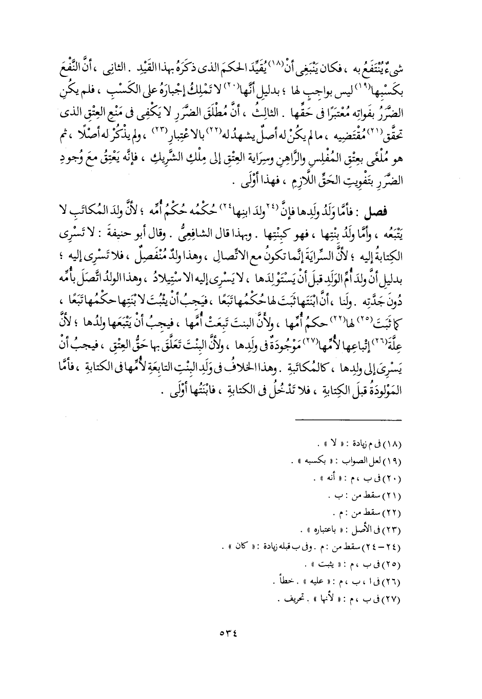 شىءٌ يُنْتَفَعُ به، فكان يَنْبَغِى أَنْ (١٨) يُقَيِّدَ الحكمَ الذى ذكَرَهُ بهذا القَيْدِ. الثانِى، أَنَّ النَّفْعَ بكَسْبِها (١٩) ليس بواجِبٍ لها؛ بدليلِ أنَّها (٢٠) لا تَمْلِكُ إجْبارَهُ على الكَسْبِ، فلم يكُنِ الضَّرَرُ بفَواتِه مُعْتبَرًا فى حَقِّها. الثالِثُ، أَنَّ مُطْلَقَ الضَّرَرِ لا يَكْفِى فى مَنْعِ العِتْقِ الذى تحقَّق (٢١) مُقْتَضِيه، ما لم يكُن له أصلٌ يشهدُ له (٢٢) بالاعْتِبارِ (٢٣)، ولم يذْكُرْ له أصْلًا، ثم هو مُلْغًى بعِتْقِ المُفْلِسِ والرَّاهِنِ وسِرَاية العِتْقِ إلى مِلْكِ الشَّرِيكِ، فإنَّه يَعْتِقُ معَ وُجودِ الضَّرَرِ بتَفْوِيتِ الحَقِّ اللَّازِمِ، فهذا أوْلَى.