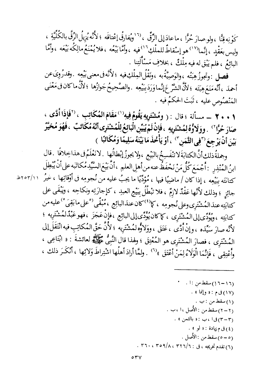 ٢٠٠١ - مسألة؛ قال: (ومُشْتَرِيهِ يَقُومُ فِيهِ (١) مَقَامَ المُكَاتِبِ، [فَإِذَا أَدَّى، صَارَ حُرًّا] (٢). ووَلَاؤُهُ لِمُشْتَرِيهِ، فَإِنْ لَمْ يُبَيِّنِ الْبَائِعُ لِلْمُشْتَرِى أَنَّهُ مُكَاتَبٌ، فَهُوَ مُخَيَّرٌ بَيْنَ أَنْ يَرْجِعَ [فِى الثَّمَنِ] (٣)، أَوْ يَأْخُذَ مَا بَيْنَهُ سَلِيمًا وَمُكَاتَبًا)