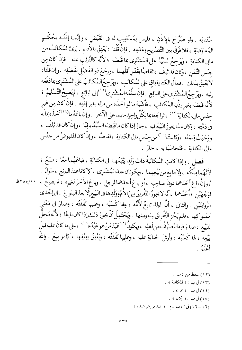 فصل: وإذا كانتِ المُكاتَبةُ ذاتَ وَلَدٍ يَتْبَعُها فى الكتابَةِ، فباعَهُما معًا، صَحَّ؛ لأنَّهُما مِلْكُه، ولا مانِعَ من بَيْعِهما، ويكونان عندَ المُشْتَرِى، كما كانا عندَ البائِعِ، سَواءً. وإِنْ باعَ أحَدَهما دونَ صاحِبِه، أو باعَ أحدَهما لرجلٍ، وباعَ الآخَرَ لغيرِه، لم يصِحَّ، لوَجْهَيْنِ؛ أَحَدُهما، أنَّه لا يجوزُ التَّفْرِيقُ بينَ الأُمِّ وَوَلَدِها فى البَيْعِ إِلَّا بعدَ البلوغِ. فى إحْدَى الرِّوايَتَيْنِ. والثانى، أَنَّ الولدَ تابِعٌ لأُمِّه، ولها كَسْبُه، وعليها نَفَقَتُه، وصارَ فى مَعْنَى مَمْلوكِها، فلم يَجُزِ التَّفْرِيقُ بينَه وبينَها. ويَحْتَمِلُ أَنْ يجوزَ ذلك إذا كان بالِغًا؛ لأَنَّه مَحلٌّ للبَيْعِ، صدرَ فيه التَّصَرُّفُ من أهلِه، ويكونُ [عَبْدَ مَنْ هو عَبْدُه] (١٦)، على ما كانَ عليه قبلَ بَيْعِه، لها كَسْبُه، وأرشُ الجنايَةِ عليه، وعليها نَفَقَتُه، ويَعْتِقُ بعِتْقِها، كما لو بِيعَ. واللَّهُ أعْلَمُ.