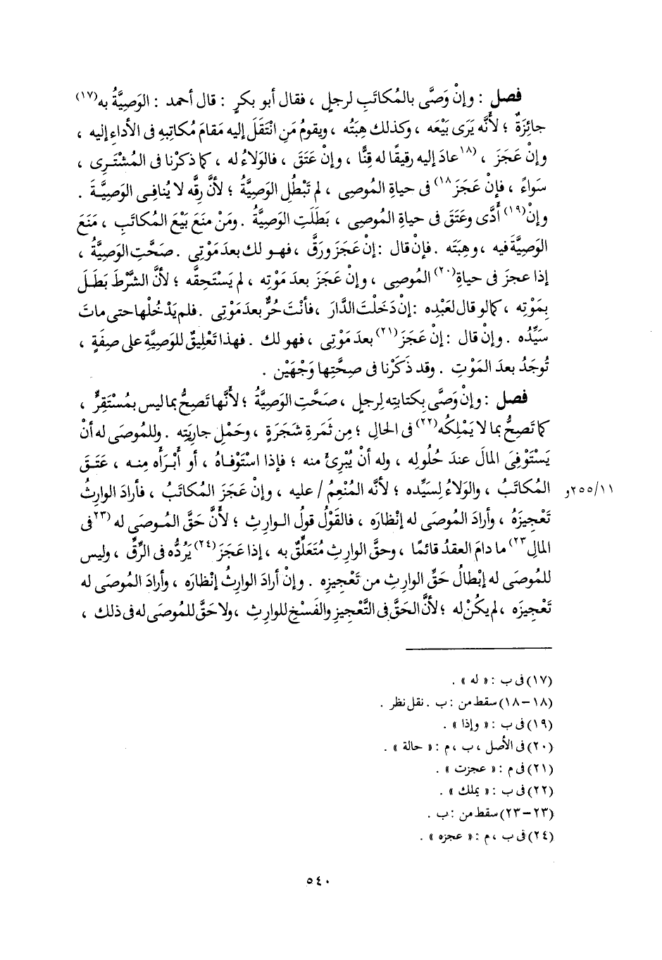 فصل: وإِنْ وَصَّى بالمُكاتَبِ لرجلٍ، فقال أبو بكرٍ: قال أحمد: الوَصِيَّةُ به (١٧) جائِزَةٌ؛ لأَنَّه يَرَى بَيْعَه، وكذلك هِبَتُه، ويقومُ مَنِ انْتَقَلَ إليه مَقامَ مُكاتِبهِ فى الأداءِ إليه، وإِنْ عَجَزَ، [عادَ إليه رقيقًا له قِنًّا، وإِنْ عَتَقَ، فالوَلاءُ له، كما ذكرْنا فى المُشْتَرِى، سَواءً، فإنْ عَجَزَ] (١٨) فى حياةِ المُوصِى، لم تَبْطُلِ الوَصِيَّةُ؛ لأنَّ رِقَّه لا يُنافِى الوَصِيَّةَ. وإِنْ (١٩) أَدَّى وعَتَقَ فى حياةِ المُوصِى، بَطَلَتِ الوَصِيَّةُ. ومَنْ منَعَ بَيْعَ المُكاتَبِ، مَنَعَ الوَصِيَّةَ فيه، وهِبَتَه. فإنْ قال: إِنْ عَجَزَ ورَقَّ، فهو لك بعدَ مَوْتِى. صَحَّتِ الوَصِيَّةُ، إذا عجزَ فى حياةِ (٢٠) المُوصِى، وإِنْ عَجَزَ بعدَ مَوْتِه، لم يَسْتَحِقَّه؛ لأنَّ الشَّرْطَ بَطَلَ بِمَوْتِه، كما لو قال لعَبْدِه: إِنْ دَخَلْتَ الدَّارَ، فأنْتَ حُرٌّ بعدَ مَوْتِى. فلم يَدْخُلْها حتى ماتَ سَيِّدُه. وإِنْ قال: إِنْ عَجَزَ (٢١) بعدَ مَوْتِى، فهو لك. فهذا تَعْلِيقٌ للوَصِيَّةِ على صِفَةٍ، تُوجَدُ بعدَ المَوْتِ. وقد ذَكَرْنا فى صِحَّتِها وَجْهَيْن.