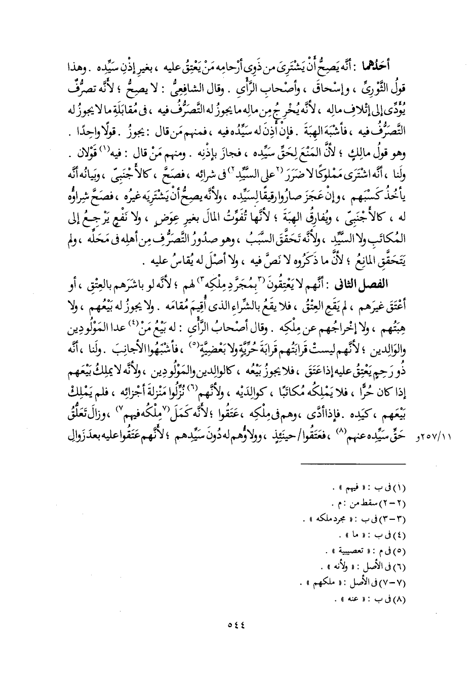 أحَدُهما: أنَّه يَصِحُّ أَنْ يَشْتَرِىَ من ذَوِى أرْحامِه مَنْ يَعْتِقُ عليه، بغيرِ إذْنِ سَيِّدِه. وهذا قولُ الثَّوْرِىِّ، وإسْحاقَ، وأصْحابِ الرَّأْىِ. وقال الشافِعِىُّ: لا يصِحُّ، لأَنَّه تصرُّفٌ يُؤَدِّى إلى إتْلافِ مالِه؛ لأَنَّه يُخْرِج مِن مالِه ما يجوزُ له التَّصَرُّفُ فيه، فى مُقابَلَةِ ما لا يجوزُ له التَّصَرُّفُ فيه، فأشْبَهَ الهِبَةَ. فإِنْ أَذِنَ له سَيِّدُه فيه، فمنهم مَن قال: يجوزُ. قولًا واحِدًا. وهو قولُ مالِكٍ؛ لأنَّ المَنْغَ لِحَقِّ سَيِّدِه، فجازَ بإذْنِه. ومنهم مَنْ قال: فيه (١) قَوْلان. ولَنا، أنَّه اشْتَرَى مَمْلوكًا لا ضَرَرَ [على السَّيِّدِ] (٢) فى شرائِه، فصَحَّ، كالأَجْنَبِىّ، وبَيانُه أنَّه يأخُذُ كَسْبَهم، وإِنْ عَجَزَ صارُوا رقيقًا لِسَيِّدِه، ولأنَّه يصِحُّ أَنْ يَشْتَرِيَه غيرُه، فصَحَّ شِراؤُه له، كالأَجْنَبِىّ، ويُفارِقُ الهِبَةَ؛ لأنَّها تُفَوتُ المالَ بغيرِ عِوَضٍ، ولا نَفْعٍ يَرْجِعُ إلى المُكاتَبِ ولا السَّيِّدِ، ولأنَّه تَحَقَّقَ السَّبَبَ، وهو صدُورُ التَّصَرُّفِ مِن أهلِه فى مَحَلِّه، ولم يَتَحَقَّقِ المانِعُ؛ لأنَّ ما ذَكَرُوه لا نَصَّ فيه، ولا أصْلَ له يُقاسُ عليه.