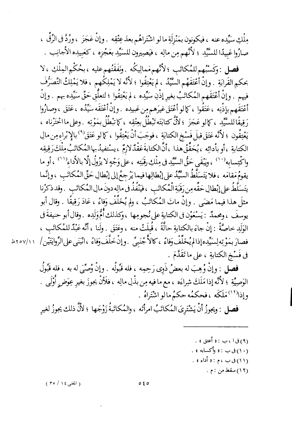 فصل: كسْبُهم للمُكاتَبِ؛ لأنَّهم مَمالِيكُه. ونَفَقَتُهم عليه، بحُكْمِ المِلْكِ، لا بحكمِ القَرابَةِ. وإِنْ أعْتَقَهُم السَّيِّدُ، لم يَعْتِقُوا؛ لأَنَّه لا يَمْلِكُهم، فلا يَمْلِكُ التَّصَرُّفَ فيهم. وإِنْ أعْتقهم المُكاتَبُ بغيرِ إذْنِ سَيِّدِه، لم يَعْتِقُوا؛ لتعلُّقِ حَقِّ سَيِّدِه بهما. وإِنْ أعْتَقَهم بإذْنِه، عَتَقُوا، كما لو أعْتَقَ غيرَهم مِن عَبيدِه. وإِنْ أعْتَقَه سَيِّدُه، عَتَقَ، وصارُوا رَقِيقًا للسَّيِّدِ، كالو عَجَزَ؛ لأنَّ كتابَتَه تَبْطُلُ بعِتْقِه، كما تبْطُلُ بمَوْتِه. وعلى ما اخْتَرْناه، يَعْتِقُون؛ لأَنَّه عَتَقَ قبلَ فَسْخِ الكتابَةِ، فوجَبَ أَنْ يَعْتِقُوا، كما لو عَتَقَ (٩) بالإِبْراءِ مِن مالِ الكتابةِ، أو بأدائِه، يُحَقِّقُ هذا، أَنَّ الكتابةَ عَقْدٌ لازِمٌ، يسْتفيدُ بها المُكاتَبُ مِلْكَ رقِيقِه واكْتِسابِه (١٠)، ويَبْقَى حَقُّ السَّيِّدِ فى مِلْكِ رقَبَتِه، على وَجْهٍ لا يزُولُ إِلَّا بالأداءِ (١١)، أو ما يقومُ مَقامَه، فلا يَتَسَلَّطُ السَّيِّدُ على إبْطالِها فيما يَرْجِعُ إلى إبْطالِ حَقِّ المُكاتَبِ، وإنَّما يتَسَلَّطُ على إبْطالِ حَقِّه مِن رَقَبَةِ الْمُكاتَبِ، فيَنْفُذُ فى مالِه دونَ مالِ المُكاتَبِ. وقد ذكرْنا مثلَ هذا فيما مَضَى. وإِنْ ماتَ المُكاتَبُ، ولم يُخَلِّفْ وَفاءً، عَادَ رَقِيقًا. وقال أبو يوسفَ، ومحمدٌ: يَسْعَوْن فى الكتابةِ على نُجومِها، وكذلك أُمُّ وَلَدِه. وقال أبو حنيفةَ فى الوَلَدِ خاصَّةً: إِنْ جاءَ بالكتابةِ حالَّةً، قُبِلَتْ منه، وعَتَقَ. ولَنا، أنَّه عَبْدٌ للمُكاتَبِ، فصارَ بمَوْتِه لِسَيِّدِه إذا لم يُخَلِّفْ وَفاءً، كالأَجْنَبِىِّ. وإِنْ خَلَّفَ وَفاءً، انْبَنَى على الرِّوايَتَيْن فى فَسْخِ الكتابةِ، على ما تَقَدَّمَ.