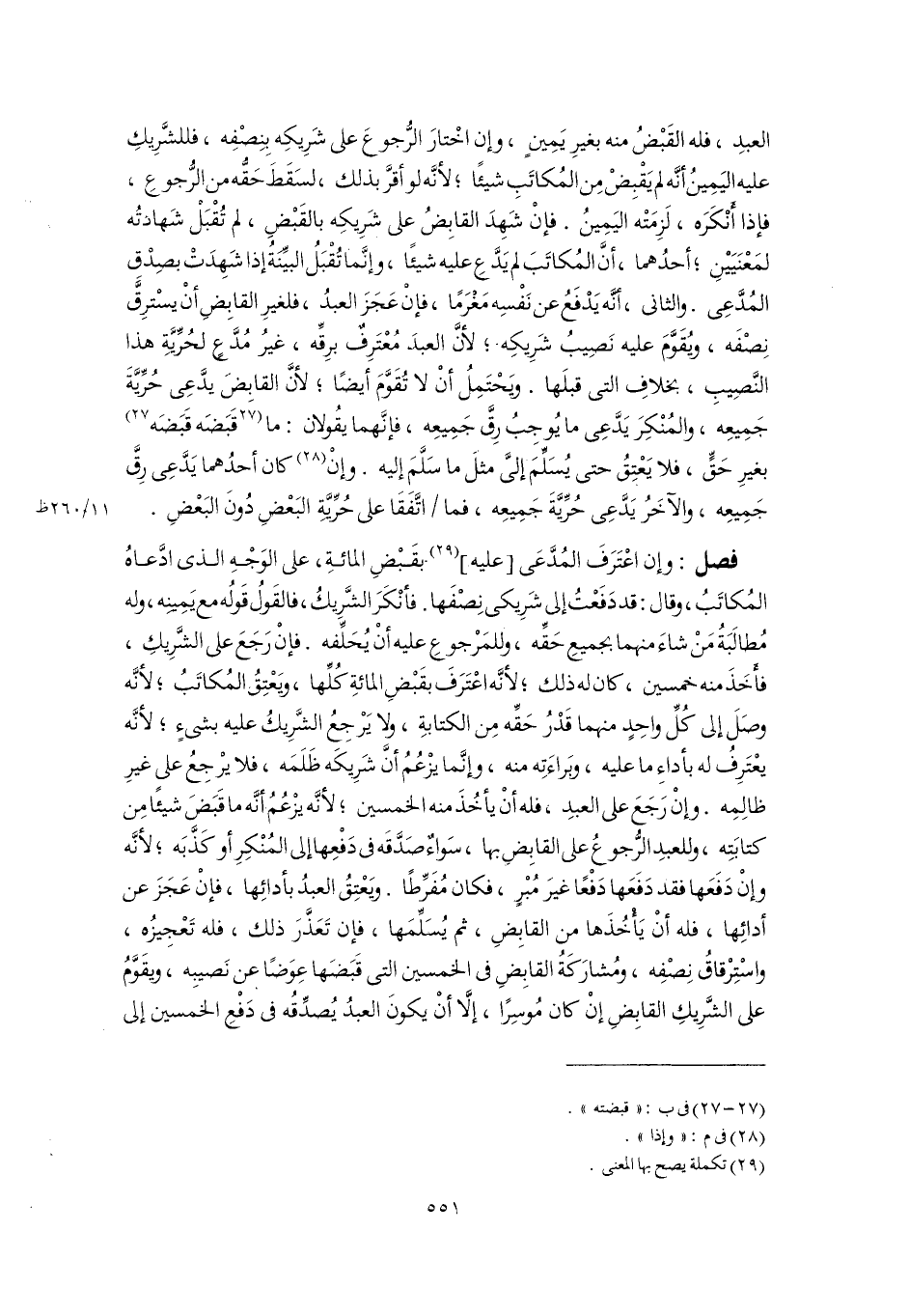 العبدِ، فله القَبْضُ منه بغيرِ يَمِينٍ، وإن اخْتارَ الرُّجوعَ على شَرِيكِه بِنِصْفِه، فللشَّرِيكِ عليه اليَمِينُ أنَّه لم يَقْبِضْ مِن المُكاتَبِ شيئًا؛ لأَنَّه لو أقرَّ بذلك، لسَقَطَ حَقُّه من الرُّجوعِ، فإذا أَنْكَرَه، لَزِمَتْه اليَمِينُ. فإنْ شَهِدَ القابِضُ على شَرِيكِه بالقَبْضِ، لم تُقْبَلْ شَهادتُه لمَعْنَيَيْنِ؛ أحدُهما، أَنَّ المُكاتَبَ لم يَدَّعِ عليه شيئًا، وإنَّما تُقبَلُ البَيِّنَةُ إذا شَهِدَتْ بصِدْقِ المُدَّعِى. والثانى، أنَّه يَدْفَعُ عن نَفْسِه مَغْرَمًا، فإنْ عَجَزَ العبدُ، فلغيرِ القابِضِ أَنْ يسْترِقَّ نِصْفَه، ويُقَوَّمَ عليه نَصِيبُ شَرِيكِه؛ لأنَّ العبدَ، مُعْتَرِفٌ برِقِّه، غيرُ مُدَّعٍ لحُرِّيَّةِ هذا النَّصِيبِ، بخلافِ التى قبلَها. ويحْتَمِلُ أَنْ لا تُقَوَّمَ أيضًا؛ لأنَّ القابضَ يدَّعِى حُرِّيَّةَ جَمِيعِه، والمُنْكِرَ يَدَّعِى ما يُوجِبُ رِقَّ جَمِيعِه، فإنَّهما يقُولان: ما [قَبَضَه قَبَضَه] (٢٧) بغيرِ حَقٍّ، فلا يَعْتِقُ حتى يُسَلِّمَ إلىَّ مثلَ ما سَلَّمَ إليه. وإِنْ (٢٨) كان أحدُهما يَدَّعِى رِقَّ جَمِيعِه، والآخَرُ يَدَّعِى حُرِّيَّةَ جَمِيعِه، فما اتَّفَقَا على حُرِّيَّةِ البَعْضِ دُونَ البَعْضِ.