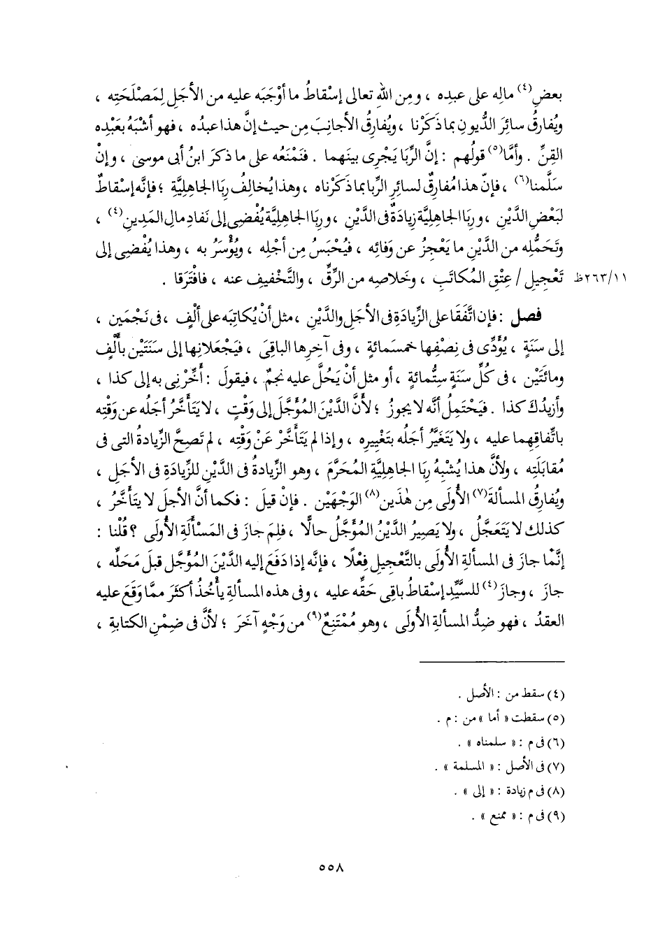 فصل: فإن اتَّفَقَا على الزِّيادَةِ فى الأجَلِ والدَّيْنِ، مثل أَنْ يُكاتِبَه على ألْفٍ، فى نَجْمَين، إلى سَنَةٍ، يُؤَدِّى فى نِصْفِها خمسَمائةٍ، وفى آخِرِها الباقِىَ، فيَجْعَلانِها إلى سَنَتَيْن بأَلْفٍ ومائتَيْن، فى كُلِّ سَنَةٍ سِتُّمائةٍ، أو مثل أَنْ يَحُلَّ عليه نجمٌ، فيقولَ: أَخِّرْنِى به إلى كذا، وأزيدُكَ كذا. فيَحْتَمِلُ أنَّه لا يجوزُ؛ لأنَّ الدَّيْنَ المُؤَجَّلَ إلى وَقْتٍ، لا يَتَأَخَّرُ أجَلُه عن وَقْتِه باتِّفاقِهِما عليه، ولا يَتَغَيَّرُ أجَلُه بتَغْيِيرِه، وإذا لم يَتَأَخَّرْ عَنْ وَقْتِه، لم تَصِحَّ الزِّيادةُ التى فى مُقابَلَتِه، ولأنَّ هذا يُشْبِهُ رِبَا الجاهِلِيَّةِ المُحَرَّمَ، وهو الزِّيادةُ فى الدَّيْنِ للزِّيادَةِ فى الأجَلِ، ويُفارِقُ المسألةَ (٧) الأُولَى مِن هذَين (٨) الوَجْهَيْن. فإنْ قيلَ: فكما أَنَّ الأجلَ لا يتَأَخَّرُ، كذلك لا يَتَعَجَّلُ، ولا يَصِيرُ الدَّيْنُ المُؤَجَّلُ حالًّا، فلِمَ جازَ فى المَسْأَلَةِ الأُولَى؟ قُلْنا: إنَّما جازَ فى المسألةِ الأُولَى بالتَّعْجِيلِ فِعْلًا، فإنَّه إذا دَفَعَ إليه الدَّيْنَ المُؤَجَّل قبلَ مَحَلِّه، جازَ، وجازَ (٤) للسَّيِّدِ إسْقاطُ باقِى حَقِّه عليه، وفى هذه المسألةِ يأْخُذُ أكثَرَ ممَّا وَقَعَ عليه العقدُ، فهو ضِدُّ المسألةِ الأُولَى، وهو مُمْتَنعٌ (٩) من وَجْهٍ آخَرَ؛ لأنَّ فى ضِمْنِ الكتابةِ،