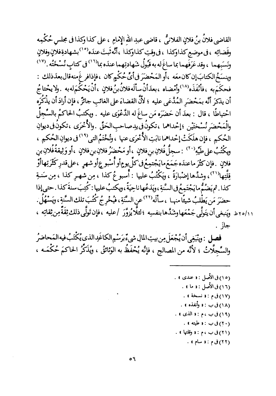 القاضى فلانُ بنُ فلانٍ الفلانيُّ، قاضى عبدِ اللهِ الإمامِ، على كذا وكذا في مجلسِ حُكْمِه وقَضائِه، في موضعِ كذا وكذا، في وقتِ كذا وكذا، أنَّه ثَبتَ عندَه (١٥) بشهادةِ فلانٍ وفلانٍ ونَسَبِهما، وقد عَرَفَهما بما ساغَ له به قَبُولُ شَهادتِهما عندَه بما (١٦) في كتابٍ نُسْخَتُه. (١٧) وينسَخُ الكتابَ إن كان معَه، أو المَحْضَرَ في أيِّ حُكْمٍ كان، فإذا فرغَ منه قال بعدَ ذلك: فحكَمَ به، فأنْفَذَه (١٨) وأمْضاه، بعدَ أنْ سألَه فلانُ بنُ فلانٍ، أنْ يَحْكُمَ له به. ولا يحْتاجُ أن يذكرَ أنَّه بمَحْضَرِ المُدَّعَى عليه؛ لأنَّ القضاءَ على الغائبِ جائزٌ، فإن أرادَ أن يذْكُرَه احْتياطًا، قال: بعدَ أن حَضَرَه مَن ساغَ له الدَّعْوَى عليه. ويكتبُ الحاكمُ بالسِّجِلِّ والْمَحْضَرِ نُسْختَيْن؛ إحْداهما، تكونُ في يد صاحبِ الحَقِّ. والأُخْرَى، تكونُ في ديوانِ الحُكمِ، فإن هلَكَتْ إحْداهما نابَتِ الأُخْرَى عنها، وتُخْتَمُ التى (١٩) في ديوانِ الحُكمِ، ويكْتُبُ على طَيِّهِ (٢٠): سجِلُّ فُلانِ بنِ فلانٍ، أو مَحْضَرُ فلانِ بنِ فلانٍ، أو وَثِيقةُ فُلانِ بنِ فلانٍ. فإن كثُرَ ما عندَه جَمَعَ ما يَجْتمِعُ في كلِّ يومٍ أو أُسْبوعٍ أو شهرٍ، على قدرِ كَثْرَتِها أوْ قِلَّتِها (٢١)، وشدَّها إضْبارَةً، ويَكْتُبُ عليها: أُسبوعُ كذا، مِن شهرِ كذا، مِن سَنةِ كذا. ثم يَضُمُّ ما يَجْتَمِعُ في السَّنةِ، ويَدَعُها ناحِيَةً، ويكتبُ عليها: كُتِبَ سنةَ كذا. حتى إذا حضَرَ مَن يَطْلبُ شيئًا منها، سألَه (٢٢) عن السَّنَةِ، فيُخْرِجُ كُتُبَ تلك السَّنةِ، ويَسْهُلُ. ويَنبغى أن يتَولَّى جَمْعَها وشَدَّها بنفسِه؛ لئلَّا يُزوَّرَ عليه، فإن تَولَّى ذلك ثِقَةٌ مِن ثِقاتِه، جازَ.