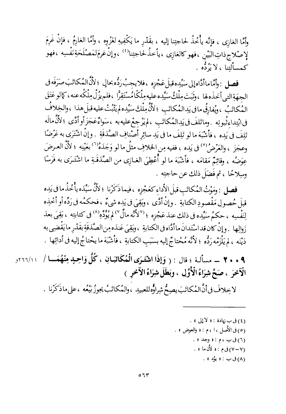 فصل: وأمَّا ما أدَّاه إلى سَيِّدِه قبلَ عَجْزِه، فلا يجِبُ رَدُّه بحالٍ؛ لأنَّ المُكاتَبَ صَرَفَه فى الجهَةِ التى أخَذَه لها، وَثبَتَ مِلْكُ سَيِّدِه عليه مِلْكًا مُسْتَقِرًّا، فلم يزُلْ مِلْكُه عنه، كما لو عَتَقَ المُكاتَبُ، ويُفارِقُ ما فى يَد المُكاتَبِ؛ لأنَّ مِلْكَ سَيِّدِه لم يَثْبُتْ عليه قبلَ هذا، والخِلافُ فى ابْتِداءِ ثُبوتِه. وما تَلفَ فى يَدِ المُكاتَبِ، لم يَرْجعْ عليه به، سَواءٌ عَجَزَ أو أدَّى؛ لأنَّ مالَه تَلِفَ فى يَده، فأشْبَهَ ما لو تَلِفَ ما فى يَد سائِرِ أَصْنافِ الصَّدَقَةِ. وإِنْ اشْتَرَى به عَرْضًا وعجَزَ، والعَرْضُ (٥) فى يَده؛ ففيه مِن الخلافِ مثلُ ما لو وَجَدَهُ (٦) بعَيْنِه؛ لأنَّ العرضَ عِوَضُه، وقائِمٌ مَقامَه، فأشْبَهَ ما لو أُعْطِىَ الغازِى من الصَّدَقَةِ ما اشْتَرَى به فَرَسًا وسِلاحًا، ثم فَضَلَ ذلك عن حاجتِه.