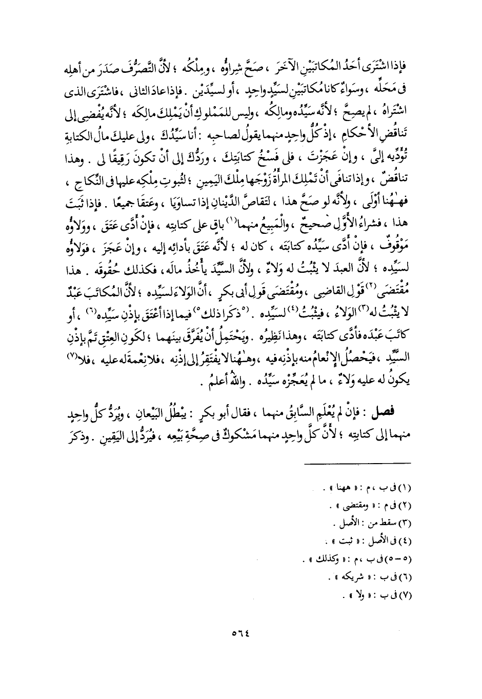 فإذا اشْتَرَى أحَدُ المُكاتبَيْنِ الآخَرَ، صَحَّ شِراؤُه، ومِلْكُه؛ لأنَّ التَّصَرُّفَ صَدَرَ من أهلِه فى مَحَلِّه، وسَواءٌ كانا مُكاتبَيْنِ لسَيِّدٍ واحِدٍ، أو لسيِّدَيْن. فإذا عادَ الثانى، فاشْتَرَى الذى اشْتَراهُ، لم يصِحَّ؛ لأَنَّه سَيِّدُه ومالِكُه، وليس للمَمْلوكِ أَنْ يَمْلِكَ مالِكَه؛ لأَنَّه يُفْضِى إلى تَناقُضِ الأحكامِ، إذْ كُلُّ واحِدٍ منهما يقولُ لصاحبِه: أنا سَيِّدُكَ، ولى عليكَ مالُ الكتابةِ تُؤَدِّيه إلىَّ، وإِنْ عَجَزْتَ، فلى فَسْخُ كتابَتِكَ، ورَدُّكَ إلى أَنْ تكونَ رَقِيقًا لى. وهذا تناقُضٌ، وإذا تنافَى أَنْ تَمْلِكَ المرأةُ زَوْجَها مِلْكَ اليَمِينِ؛ لثُبوتِ مِلْكِه عليها فى النِّكاحِ، فههُنا أوْلَى، ولأنَّه لو صَحَّ هذا، لتَقاصَّ الدَّيْنانِ إذا تساوَيَا، وعَتقَا جميعًا. فإذا ثَبَتَ هذا، فشراءُ الأَوَّلِ صحيحٌ، والْمبِيعُ منهما (١) باقٍ على كتابتِه، فإنْ أدَّى عَتَقَ، ووَلاؤُه مَوْقُوفٌ، فإنْ أدَّى سَيِّدُه كتابَتَه، كان له؛ لأَنَّه عَتَقَ بأدائِه إليه، وإِنْ عَجَزَ، فوَلاؤُه لسَيِّدِه؛ لأنَّ العبدَ لا يثْبُتُ له وَلاءٌ، ولأنَّ السَّيِّدَ يأْخُذُ مالَه، فكذلك حُقُوقَه. هذا مُقْتَضَى (٢) قَوْلِ القاضِى، ومُقْتَضَى قَولِ أبى بكرٍ، أَنَّ الوَلاءَ لسَيِّدِه؛ لأنَّ المُكاتَبَ عَبْدٌ لا يثْبُتُ له (٣) الوَلاءُ، فيثْبُتُ (٤) لسَيِّدِه. [ذكَرا ذلك] (٥) فيما إذا أعْتَقَ بإذْنِ سَيِّدِه (٦)، أو كاتَبَ عَبْدَه فأدَّى كتابَتَه، وهذا نَظيرُه. ويَحْتَمِلُ أَنْ يُفَرَّقَ بينَهما؛ لكَونِ العِتْقِ تَمَّ بإذْنِ السَّيِّدِ، فيَحْصُلُ الإِنْعامُ منه بإذْنِه فيه، وههُنا لا يفْتَقِرُ إلى إذْنِه، فلا نِعْمةَ له عليه، فلا (٧) يكونُ له عليه وَلاءٌ، ما لم يُعَجِّزْه سَيِّدُه. واللَّهُ أعلمُ.