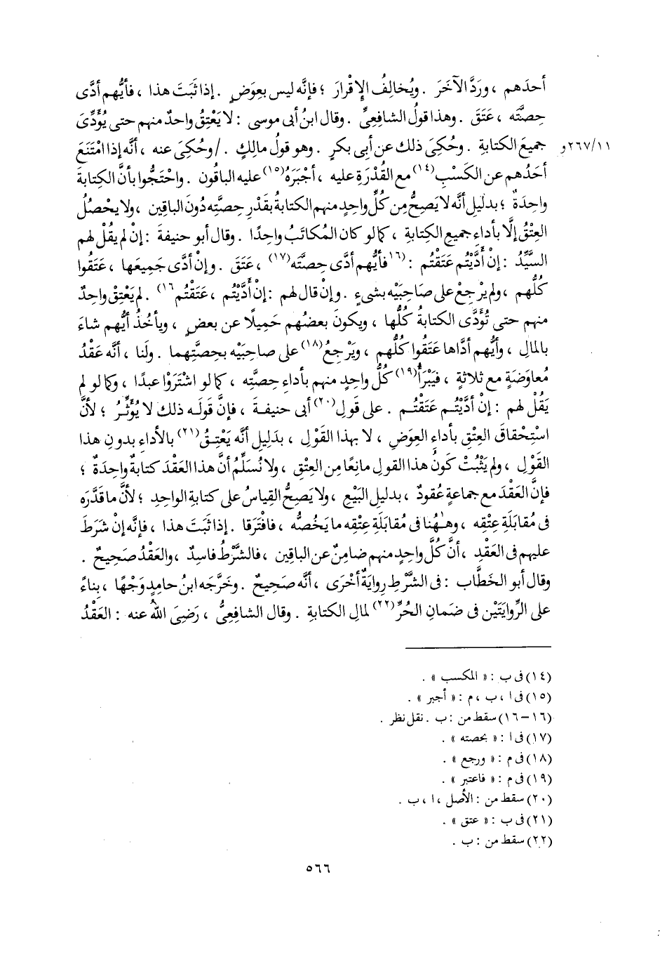أحدَهم، ورَدَّ الآخَرَ. ويُخالِفُ الإِقْرارَ؛ فإنَّه ليس بعِوَضٍ. إذا ثَبَتَ هذا، فأيُّهم أدَّى حِصَّتَه، عَتَقَ. وهذا قولُ الشافِعِىِّ. وقال ابنُ أبى موسى: لا يَعْتِقُ واحدٌ منهم حتى يُؤَدِّىَ جميعَ الكتابةِ. وحُكِىَ ذلك عن أبِى بكرٍ. وهو قولُ مالِكٍ. وحُكِىَ عنه، أنَّه إذا امْتَنَعَ أحَدُهم عن الكَسْبِ (١٤) مع القُدْرَةِ عليه، أجْبَرَهُ (١٥) عليه الباقُون. واحْتَجُّوا بأنَّ الكِتابةَ واحِدَةٌ؛ بدليلِ أنَّه لا يَصِحُّ مِن كُلِّ واحِدٍ منهم الكتابةُ بقَدْرِ حِصَّتِه دُونَ الباقِين، ولا يحْصُلُ العِتْقُ إِلَّا بأداءِ جميعِ الكِتابةِ، كما لو كان المُكاتَبُ واحِدًا. وقال أبو حنيفةَ: إِنْ لم يقُلْ لهم السَّيِّدُ: إِنْ أَدَّيْتُم عَتَقْتُم: [فأيُّهم أدَّى حِصَّتَهَ (١٦)، عَتَقَ. وإِنْ أدَّى جَمِيعَها، عَتَقُوا كُلُّهم، ولم يرْجِعْ على صَاحِبَيْه بشىءٍ. وإِنْ قال لهم: إِنْ أَدَّيْتُم، عَتَقْتُم] (١٧). لم يَعْتِقْ واحِدٌ منهم حتى تُؤَدَّى الكتابةُ كُلُّها، ويكونَ بعضُهم حَمِيلًا عن بعضٍ، ويأخُذُ أيُّهم شاءَ بالمالِ، وأيُّهم أدَّاها عَتَقُوا كُلُّهم، ويَرْجِعُ (١٨) على صاحِبَيْه بحِصَّتِهما. ولَنا، أنَّه عَقْدُ مُعاوَضَةٍ مع ثلاثةٍ، فيَبْرأُ (١٩) كُلُّ واحِدٍ منهم بأداءِ حِصَّتِه، كما لو اشْتَرَوْا عبدًا، وكما لو لم يَقُلْ لهم: إِنْ أدَّيْتُم عَتَقْتُم. على قَولِ (٢٠) أبى حنيفةَ، فإِنَّ قَولَه ذلك لا يُؤثِّرُ؛ لأنَّ اسْتِحْقاقَ العِتْقِ بأداءِ العِوَضِ، لا بهذا القَوْلِ، بدَلِيلِ أنَّه يَعْتِقُ (٢١) بالأداءِ بدونِ هذا القَوْلِ، ولم يَثْبُتْ كَونُ هذا القولِ مانِعًا مِن العِتْقِ، ولا نُسَلِّمُ أَنَّ هذا العَقْدَ كتابةٌ واحِدَةٌ؛ فإِنَّ العَقْدَ مع جماعةٍ عُقودٌ، بدليلِ البَيْعِ، ولا يَصِحُّ القِياسُ على كتابةِ الواحِدِ؛ لأنَّ ما قَدَّرَه فى مُقابَلَةِ عِتْقِه، وههُنا فى مُقابَلَةِ عِتْقِه ما يَخُصُّه، فافْتَرَقا. إذا ثَبَتَ هذا، فإنَّه إِنْ شَرَطَ عليهم فى العَقْدِ، أَنَّ كُلَّ واحِدٍ منهم ضامِنٌ عن الباقِين، فالشَّرْطُ فاسِدٌ، والعَقْدُ صَحِيحٌ. وقال أبو الخَطَّاب: فى الشَّرطِ رِوايَةٌ أُخْرَى، أنَّه صَحِيحٌ. وخَرَّجَه ابنُ حامِد وَجْهًا، بِناءً على الرِّوايَتَيْن فى ضَمانِ الحُرِّ (٢٢) لمالِ الكتابةِ. وقال الشافِعِىُّ، رَضِىَ اللَّهُ عنه: العَقْدُ