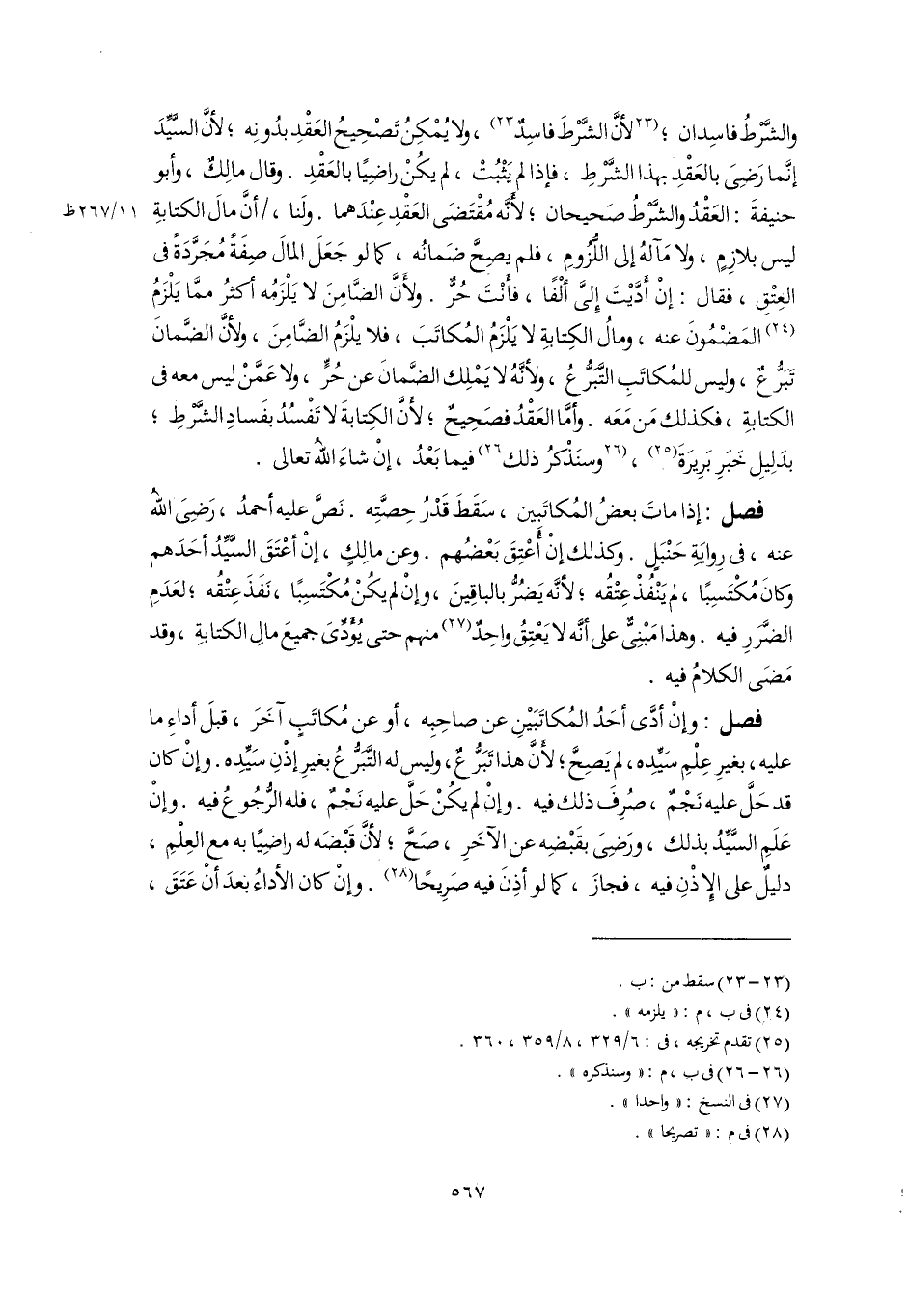 والشَّرْطُ فاسِدان؛ [لأنَّ الشَّرْطَ فاسِدٌ] (٢٣)، ولا يُمْكِنُ تَصْحِيحُ العَقْدِ بدُونِه؛ لأنَّ السَّيِّدَ إنَّما رَضِىَ بالعَقْدِ بهذا الشَّرْطِ، فإذا لم يَثْبُتْ، لم يكُنْ راضِيًا بالعَقْدِ. وقال مالِكٌ، وأبو حنيفةَ: العَقْدُ والشَّرْطُ صَحيحان؛ لأَنَّه مُقْتَضَى العَقْدِ عِنْدَهما. ولَنا، أَنَّ مالَ الكتابةِ ليس بلازمٍ، ولا مَآلهُ إلى اللُّزُومِ، فلم يصِحَّ ضَمانُه، كما لو جَعَلَ المالَ صِفَةً مُجَرَّدَةً فى العِتْقِ، فقال: إِنْ أدَّيْتَ إِلىَّ ألْفًا، فأنْت حُرٌّ. ولأَنَّ الضَّامِنَ لا يَلْزَمُه أكثرُ ممَّا يَلْزَمُ (٢٤) المَضْمُونَ عنه، ومالُ الكِتابةِ لا يَلْزَمُ المُكاتَبَ، فلا يلْزَمُ الضَّامِنَ، ولأنَّ الضَّمانَ تَبَرُّعٌ، وليس للمُكاتَبِ التَّبَرُّعُ، ولأنَّهُ لا يَمْلِك الضَّمانَ عن حُرٍّ، ولا عَمَّنْ ليس معه فى الكتابةِ، فكذلك مَن مَعَه. وأمَّا العَقْدُ فصَحِيحٌ؛ لأنَّ الكِتابةَ لا تَفْسُدُ بفَسادِ الشَّرْطِ؛ بدَلِيلِ خَبَرِ بَرِيرَةَ (٢٥)، [وسنَذْكرُ ذلك] (٢٦) فيما بَعْدُ، إِنْ شاءَ اللَّهُ تعالى.