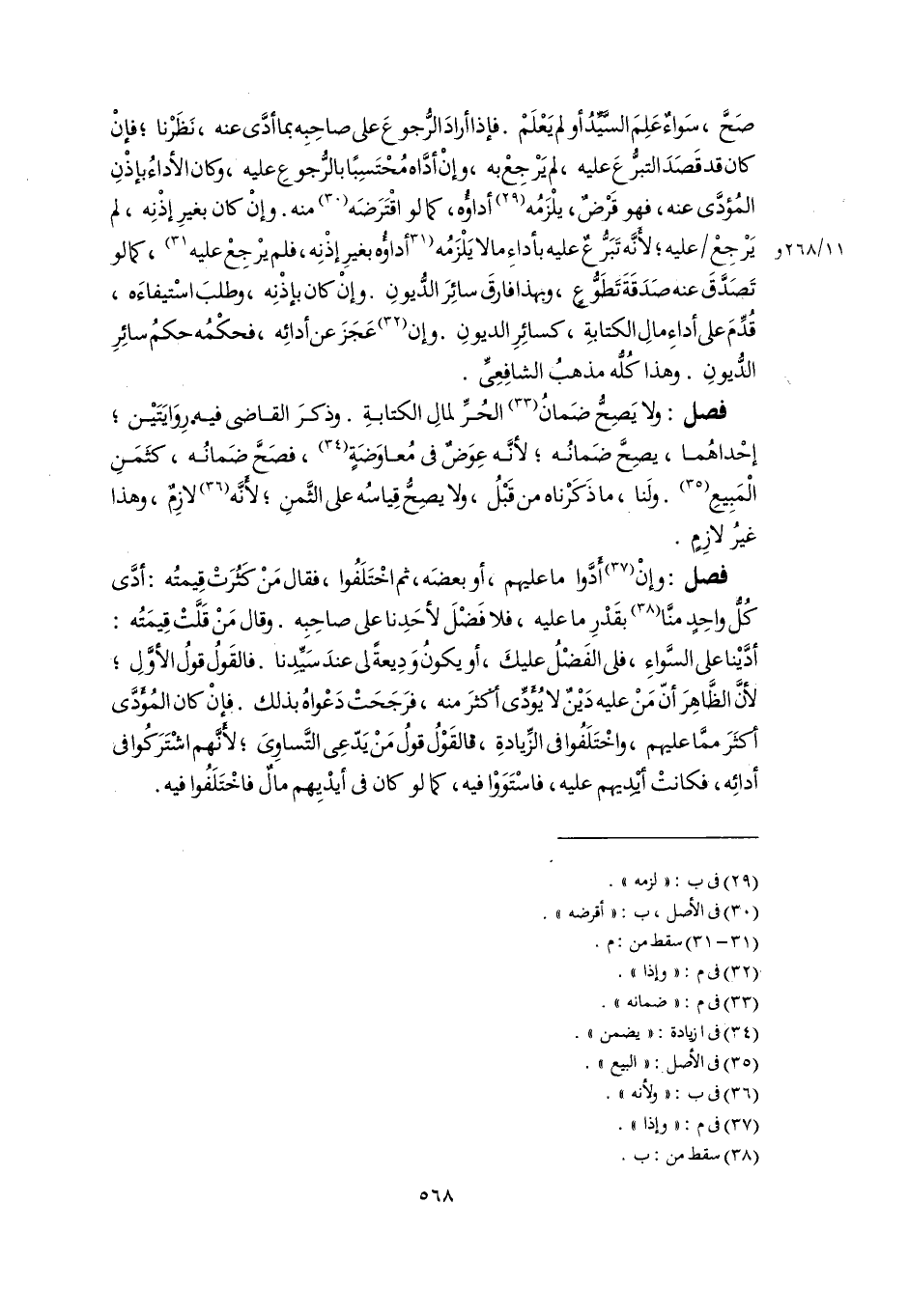 فصل: ولا يَصِحُّ ضَمانُ (٣٣) الحُرِّ لمالِ الكتابةِ. وذكرَ القاضى فيبه رِوَايَتَيْن؛ إحْداهُما، يصِحَّ ضَمانُه؛ لأَنَّه عِوَضٌ فى مُعاوَضَةٍ (٣٤)، فصَحَّ ضَمانُه، كثَمَنِ الْمَبِيعِ (٣٥). ولَنا، ما ذَكَرْناه من قَبْلُ، ولا يصِحُّ قِياسُه على الثَّمنِ؛ لأَنَّه (٣٦) لازِمٌ، وهذا غيرُ لازِمٍ.