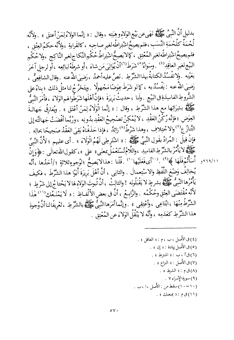 بدليلِ أَنَّ النَّبِىَّ -صلى اللَّه عليه وسلم- نَهَى عن بَيْعِ الوَلاءِ وهِبَتِه، وقال: "إنّما الولاءُ لِمَنْ أعتقَ". ولأنَّه لُحْمَةٌ كلُحْمَةِ النَّسَبِ، فلم يصِحَّ اشْتِراطُه لغيرِ صاحِبه، كالقَرابةِ، ولأنَّه حكمُ العِتْقِ، فلم يصِحَّ اشْتِراطُه لغيرِ المُعْتِقِ، كما لا يَصِحُّ اشْتِراطُ حُكمِ النِّكاحِ لغيرِ النَّاكِحِ، ولا حُكْمِ البَيْعِ لغيرِ العاقِدِ (٤). وسَواءٌ (٥) شَرَطَ (٦) أَنْ يُوَالِىَ مَن شاءَ، أو شرطَهُ لبائِعِه، أو لرجلٍ آخَرَ بعَيْنِه. ولا تفْسُدُ الكتابةُ بهذا الشَّرْطِ. نَصَّ عليه أحمدُ، رَضِىَ اللَّهُ عنه. وقال الشافِعِىُّ، رَضِىَ اللَّهُ عنه: يفْسُدُ به، كما لو شَرَطَ عِوَضًا مَجْهولًا. ويتَخَرَّجُ لنا مثلُ ذلك؛ بِناءً على الشُّروطِ الفاسِدَةِ فى البَيْعِ. ولَنا، حديثُ بَرِيرَةَ؛ فإِنَّ أهْلَها شَرَطُوا لهم الوَلاءَ، فأمَرَ النَّبِىُّ -صلى اللَّه عليه وسلم- بشِرَائِها مع هذا الشَّرْطِ، وقال: "إنَّما الْوَلَاءُ لِمَنْ أعْتَقَ". ويُفارِقُ جَهالةَ العِوَضِ؛ فإنَّه رُكْنُ العَقْدِ، لا يُمْكِنُ تصْحِيحُ العَقْدِ بدُونِه، ورُبَّما أفْضَتْ جَهالَتُه إلى التَّنازُعِ (٧) والاخْتِلافِ، وهذا شَرْطٌ (٨) زائِدٌ، فإذا حَذَفْناهُ بَقِىَ العَقْدُ صَحِيحًا بحالِه. فإنْ قيلَ: المُرادُ بقَولِ النَّبِىِّ -صلى اللَّه عليه وسلم-: "اشْتَرِطِى لَهُمُ الْوَلَاءَ". أى عليهم؛ لأَنَّ النَّبِىَّ -صلى اللَّه عليه وسلم- لا يَأْمُرُ بالشَّرطِ الفاسِدِ، واللَّامُ تُسْتَعْمَلُ بمعنَى "على"، كقولِ اللَّه تعالَى: {وَإِنْ أَسَأْتُمْ فَلَهَا} (٩). [أى فَعَلَيْها] (١٠). قُلْنا: هذا لا يَصِحُّ؛ لوُجوهٍ ثلاثةٍ؛ أحَدُاها، أنَّه يُخالِفُ وَضْعَ اللَّفْظِ والاسْتِعمالَ. والثانِى، أَنَّ أهْلَ بَرِيرَةَ أَبَوْا هذا الشَّرْطَ، فكيفَ يَأمُرُها النَّبِىُّ -صلى اللَّه عليه وسلم- بشرطٍ لا بَقْبَلُونَه! والثالِثُ، أَنَّ ثُبوتَ الوَلاءِ لها لا يَحْتاجُ إلى شَرْطٍ؛ لأَنَّه مُقْتَضَى العِتْقِ وحُكْمُه. والرَّابِعُ، أَنَّ فى بعضِ الألْفاظِ: "لَا يَمْنَعُكِ (١١) هذَا الشَّرْطُ مِنْهَا، ابْتَاعِى، وأعْتِقِى". وإنَّما أمَرَها النَّبِىُّ -صلى اللَّه عليه وسلم- بالشَّرْطِ، تَعْرِيفًا لنا أَنَّ وُجودَ هذا الشَّرْطِ كعَدَمِه، وأنَّه لا يَنْقُلُ الوَلاءَ عن المُعْتِقِ.