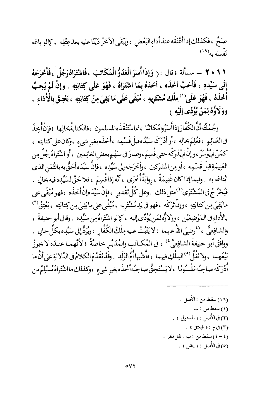 وجُمْلَتُه أَنَّ الكُفَّارَ إذا أسَرُوا مُكاتَبًا، ثم اسْتَنْقَذَه المسلمون، فالكتابةُ بحالِها؛ فإنْ أُخِذَ فى الغَنائِم، فعُلِمَ بحالِه، أو أدْرَكَه سَيِّدُه قبلَ قَسْمِه، أخَذَه بغيرِ شىءٍ، وكان على كتابتِه، كمَنْ لم يُؤْسَرْ، وإِنْ لم يُدْرِكه حتى قُسِمَ، وصارَ فى سَهْمِ بعضِ الغانِمين، أو اشْتَراهُ رجُلٌ مِن الغَنِيمَةِ قبلَ قَسْمِه، أو مِن المشركين، وأخْرَجَه إلى سَيِّدِه، فإِنَّ سَيِّدَه أحَقُّ به بالثَّمَنِ الذى ابْتاعَه به. وفيما إذا كان غَنِيمَةً، رِوايَةٌ أُخْرَى، أنَّه إذا قُسِمَ، فلا حَقَّ لسَيِّدِه فيه بحالٍ. فيُخَرَّجُ فى المُشْتَرَى (٢) مثلُ ذلك. وعلى كُلِّ تَقْديرٍ، فإِنَّ سَيِّدَه إِنْ أخَذَه، فهو مُبْقًى على ما بَقِىَ مِن كتابَتِهِ، وإِنْ تَرَكَه، فهو فى يَدِ مُشْتَرِيه، مُبْقًى على ما بَقِىَ مِن كِتابَتِه، يعْتِقُ (٣) بالأداءِ فى المَوْضِعَيْن، وَلاؤُه لمَن يُؤدِّى إليه، كما لو اشْتَراهُ مِن سَيِّدِه. وقال أبو حنيفةَ، والشافِعِىُّ، [رَضِىَ اللَّهُ عنهما: لا يَثْبُتُ عليه مِلْكُ الكُفَّارِ، ويُرَدُّ إلى سَيِّدِه بكلِّ حالٍ. ووافَقَ أبو حنيفةَ الشافِعِىَّ] (٤)، فى المُكاتَبِ والمُدَبَّرِ خاصَّةً؛ لأنَّهما عندَه لا يجوزُ بَيْعُهما، ولا نَقْلُ (٥) المِلْكِ فيهما، فأشْبها أُمَّ الوَلدِ. وقَدْ تَقَدَّمَ الكلامُ فى الدَّلالةِ على أَنَّ ما أدْرَكَه صاحِبُه مَقْسُومًا، لا يَسْتَحِقُّ صاحِبُه أخْذَه بغيرِ شىءٍ، وكذلك ما اشْتَراهُ مُسْلِمٌ من