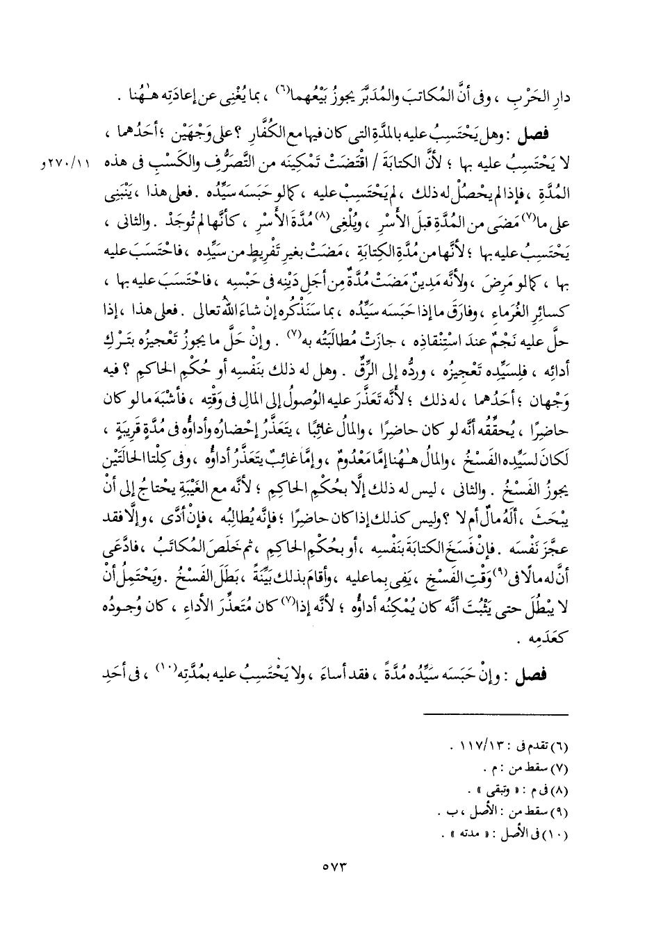 فصل: وهل يَحْتَسِبُ عليه بالمدَّةِ التى كان فيها مع الكُفَّارِ؟ على وَجْهَيْن؛ أحَدُهما، لا يَحْتَسِبُ عليه بها؛ لأنَّ الكتابَةَ اقْتَضَتْ تَمْكِينَه من التَّصَرفِ والكَسْبِ فى هذه المُدَّةِ، فإذا لم يحْصُلْ له ذلك، لم يَحْتَسِبْ عليه، كما لو حَبَسَه سَيِّدُه. فعلى هذا، يَنْبَنِى على ما (٧) مَضَى من المُدَّةِ قبلَ الأَسْرِ، ويُلْغِى (٨) مُدَّةَ الأَسْرِ، كأنَّها لم تُوجَدْ. والثانى، يَحْتَسِبُ عليه بها؛ لأنَّها من مُدَّةِ الكِتابَةِ، مَضَتْ بغيرِ تَفْرِيطٍ من سَيِّدِه، فاحْتَسَبَ عليه بها، كما لو مَرِضَ، ولأنَّه مَدِينٌ مَضَتْ مُدَّةٌ مِن أجَلِ دَيْنِه فى حَبْسِه، فاحْتَسَبَ عليه بها، كسائِرِ الغُرَماءِ، وفارَقَ ما إذا حَبَسَه سَيِّدُه، بما سَنَذْكُره إِنْ شاءَ اللَّه تعالى. فعلى هذا، إذا حلَّ عليه نَجْمٌ عندَ اسْتِنْقاذِه، جازَتْ مُطالَبَتُه به (٧). وإِنْ حَلَّ ما يجوزُ تَعْجيزُه بتَرْكِ أدائِه، فلِسَيِّدِه تَعْجِيزُه، وردُّه إلى الرِّقِّ. وهل له ذلك بنَفْسِه أو حُكْمِ الحاكمِ؟ فيه وَجْهان؛ أحَدُهما، له ذلك؛ لأَنَّه تَعَذَرَ عليه الوُصولُ إلى المالِ فى وَقْتِه، فأشْبَهَ ما لو كان حاضِرًا، يُحققُه أنَّه لو كان حاضِرًا، والمالُ غائبًا، يتَعَذَّرُ إحْضارُه وأداؤُه فى مُدَّةٍ قَرِيبَةٍ، لَكانَ لسَيِّدِه الفَسْخُ، والمالُ ههُنا إمَّا مَعْدُومٌ، وإثَا غائِبٌ يتَعَذَّرُ أداؤُه، وفى كِلْتا الحالَتَيْن يجوزُ الفَسْخُ. والثانى، ليس له ذلك إِلَّا بحُكْمِ الحاكِمِ؛ لأَنَّه مع الغَيْبَةِ يحْتاجُ إلى أَنْ يبْحَثَ، ألَهُ مالٌ أم لا؟ وليس كذلك إذا كان حاضِرًا؛ فإنَّه يُطالِبُه، فإنْ أدَّى، وإلَّا فقد عجَّزَ نَفْسَه. فإنْ فَسَخَ الكتابَةَ بنَفْسِه، أو بحُكْمِ الحاكِمِ، ثم خَلَصَ المُكاتَبُ، فادَّعَى أَنَّ له مالًا فى (٩) وَقْتِ الفَسْخِ، يَفِى بِما عليه، وأقامَ بذلك بَيِّنَةً، بَطَلَ الفَسْخُ. ويَحْتَمِلُ أَنْ لا يبْطُلَ حتى يَثْبُتَ أنَّه كان يُمْكِنُه أداؤُه؛ لأَنَّه إذا (٧) كان مُتَعذِّرَ الأداءِ، كان وُجودُه كعَدَمِه.