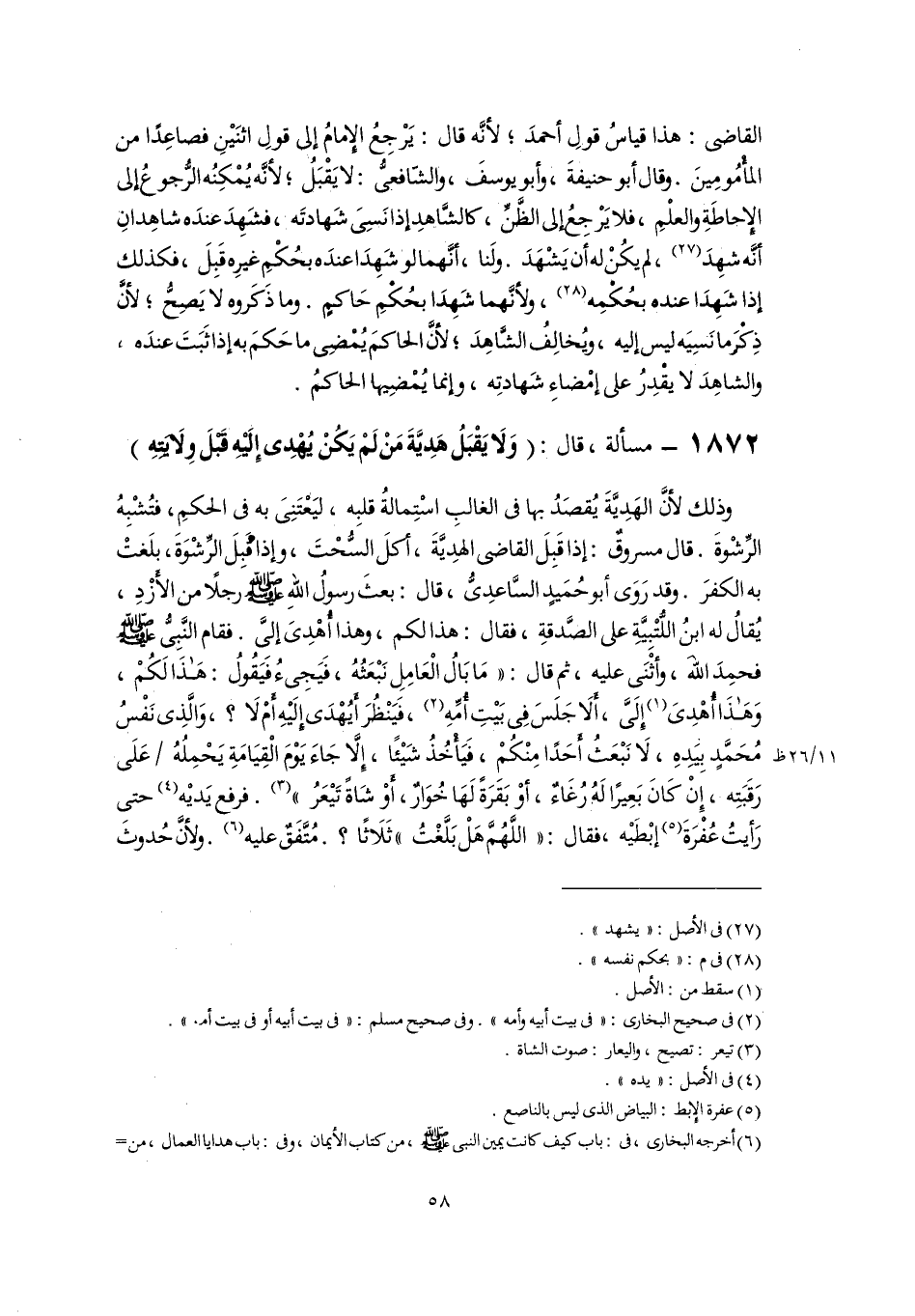 وذلك لأنَّ الهَدِيَّةَ يُقصَدُ بها في الغالبِ اسْتِمالةُ قلبِه، ليَعْتَنِىَ به في الحكمِ، فتُشْبِهُ الرِّشْوةَ. قال مسروقٌ: إذا قَبِلَ القاضى الهدِيَّةَ، أكلَ السُّحْتَ، وإذا قُبِلَ الرِّشْوَةَ، بلَغتْ به الكفرَ. وقد رَوَى أبو حُمَيدٍ السَّاعدِيُّ، قال: بعثَ رسولُ اللهِ -صَلَّى اللهُ عَلَيْهِ وَسَلَّمَ- رجلًا من الأَزْدِ، يُقالُ له ابنُ اللُّتْبِيَّةِ على الصَّدقةِ، فقال: هذا لكم، وهذا أُهْدِىَ إليَّ. فقام النَّبِيُّ -صَلَّى اللهُ عَلَيْهِ وَسَلَّمَ- فحمِدَ اللهَ، وأثْنَى عليه، ثم قال: "مَا بَالُ الْعَامِلِ نَبْعَثُهُ، فَيَجِىءُ فيَقُولُ: هَذَا لَكُمْ، وَهَذَا أُهْدِىَ (١) إلَيَّ، أَلَا جَلَسَ فِى بَيْتِ أُمِّهِ (٢)، فَيَنْظُرَ أَيُهْدَى إلَيْهِ أَمْ لَا؟ ، وَالَّذِى نَفْسُ مُحَمَّدٍ بِيَدِهِ، لَا نَبْعَثُ أَحَدًا مِنْكُمْ، فَيَأْخُذُ شَيْئًا، إِلَّا جَاءَ يَوْمَ الْقِيَامَةِ يَحْمِلُهُ عَلَى رَقَبَتِه، إِنْ كَانَ بَعِيرًا لَهُ رُغَاءٌ، أوْ بَقَرَةً لَهَا خُوَارٌ، او شَاةً تَيْعَرُ" (٣). فرفع يَديْه (٤) حتى رَأيتُ عُفْرَةَ (٥) إبْطَيْه، فقال: "اللَّهُمُّ هَلْ بَلَّغْتُ" ثَلَاثًا؟ . مُتَّفَقٌ عليه (٦). ولأنَّ حُدوثَ