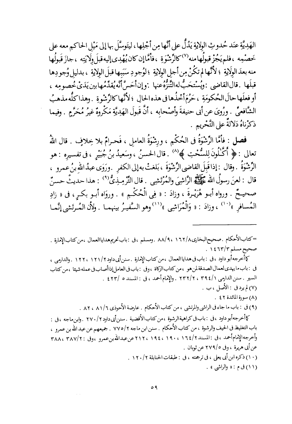فصل: فأمَّا الرِّشْوَةُ في الحُكْمِ، ورِشْوَةُ العاملِ، فَحرامٌ بلا خِلافٍ. قال اللهُ تعالى: {أَكَّالُونَ لِلسُّحْتِ} (٨). قال الحسنُ، وسَعيدُ بنُ جُبَيْرٍ، في تفسيرِه: هو الرِّشْوَةُ. وقال: إذا قَبِلَ القاضى الرِّشْوَةَ، بَلغتْ به إلى الكفرِ. ورَوَى عبدُ اللهِ بنُ عمرو، قال: لعنَ رسولُ اللَّه -صَلَّى اللهُ عَلَيْهِ وَسَلَّمَ- الرَّاشِىَ والمُرْتَشِى. قال التِّرْمِذِيُّ (٩): هذا حديثُ حسنٌ صحيحٌ. ورواه أبو هُرَيْرةَ، وزادَ: "فِى الْحُكْمِ". وروَاه أبو بكرٍ، في "زادِ المُسافرِ" (١٠)، وزادَ: "وَالْمُرَاشِى" (١١) وهو السَّفيرُ بينهما. ولأن المُرتَشى إنَّما