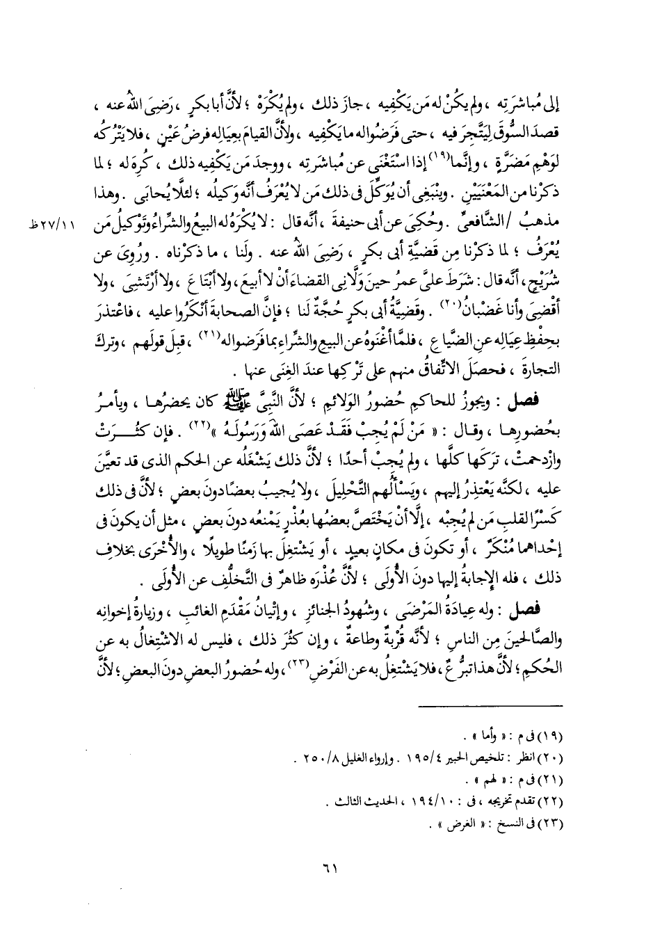 فصل: ويجوزُ للحاكمِ حُضورُ الوَلائمِ؛ لأنَّ النَّبِيَّ -صَلَّى اللهُ عَلَيْهِ وَسَلَّمَ- كان يحضرُها، ويأمرُ بحُضورِها، وقال: "مَنْ لَمْ يُجِبْ فَقَدْ عَصَى اللهَ وَرَسُولَهُ" (٢٢). فإن كثُرَتْ وازْدحمتْ، ترَكَها كلَّها، ولم يُجِبْ أحدًا؛ لأنَّ ذلك يَشْغَلُه عن الحكم الذى قد تعيَّنَ عليه، لكنَّه يَعْتذِرُ إليهم، ويَسْألُهم التَّحْلِيلَ، ولا يُجيبُ بعضًا دونَ بعضٍ؛ لأنَّ في ذلك كَسْرًا لقلبِ مَن لم يُجِبْه، إلَّا أنْ يَخْتَصَّ بعضُها بعُذْرٍ يَمْنعُه دونَ بعضٍ، مثل أن يكونَ في إحْداهما مُنْكَرٌ، أو تكونَ في مكانٍ بعيدٍ، أو يَشْتغِلَ بها زَمنًا طويلًا، والأُخْرَى بخلافِ ذلك، فله الإِجابةُ إليها دونَ الأُولَى؛ لأنَّ عُذْرَه ظاهرٌ في التَّخلُّفِ عن الأُولَى.