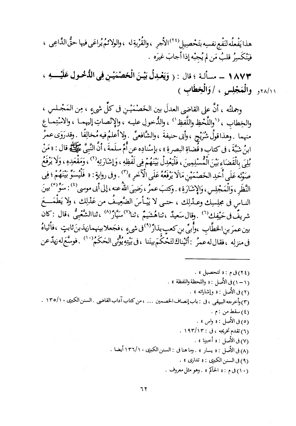 وجملتُه، أنَّ على القاضى العدلَ بين الخَصْمَيْنِ في كلِّ شىءٍ، مِن المَجْلسِ، والخِطابِ، [واللَّحْظِ واللَّفظِ] (١)، والدُّخولِ عليه، والإِنْصاتِ إليهما، والاسْتِماعِ منهما. وهذا قولُ شُرَيْحٍ، وأبى حنيفةَ، والشَّافعيِّ. ولا أعلمُ فيه مُخالِفًا. وقد رَوَى عمرُ ابنُ شَبَّةَ، في كتابِ "قُضاةِ البصرةِ"، بإسْنادِه عن أُمِّ سلَمةَ، أنَّ النَّبِيَّ -صَلَّى اللهُ عَلَيْهِ وَسَلَّمَ- قال: "مَنْ بُلِىَ بِالْقَضَاءِ بَيْنَ الْمُسْلِمِينَ، فَلْيَعْدِلْ بَيْنَهُمْ فِى لَفْظِهِ، وَإشَارَتِهِ (٢)، وَمَقْعَدِهِ، وَلَا يَرْفَعُ صَوْتَه عَلَى أَحَدِ الخَصْمَيْنِ مَا لَا يَرْفَعُهُ عَلَى الْآخَرِ" (٣). وفى روايةٍ: "فَلْيُسَوِّ بَيْنَهُمْ؛ فِى النَّظَرِ، وَالْمَجْلِسِ، وَالإِشَارَةِ". وكتبَ عمرُ، رَضِىَ اللهُ عنه، إلى أبي موسى (٤): سَوِّ (٥) بينَ الناسِ في مجلِسِك وعدْلِك، حتى لا يَيْأسَ الضَّعِيفُ من عَدْلِك، ولا يَطْمَعَ شريفٌ في حَيْفِك (٦). وقال سَعيدٌ، ثنا هُشَيمٌ، ثنا (٧) سَيَّارٌ (٨)، ثنا الشَّعْبِيُّ، قال: كان بين عمرَ بنِ الخطَّابِ، وأُبيِّ بنِ كعبٍ بِدَارٌ (٩) في شىءٍ، فجَعلا بينهما زيدَ بنَ ثابتٍ، فأتَياهُ في منزلِه، فقال له عمرُ: أتَيْناكَ لتَحْكُمَ بينَنا، في بَيْتِهِ يُؤْتَى الحَكَمُ (١٠). فوسَّعَ له زيدٌ عن