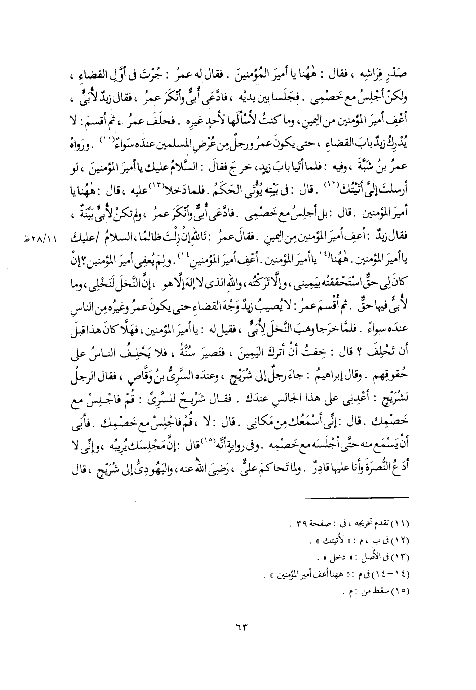 صَدْرِ فِرَاشِه، فقال: هاهُنا يا أميرَ المُؤمنينَ. فقال له عمرُ: جُرْتَ في أوَّلِ القضاءِ، ولكنْ أجْلِسُ مع خَصْمِى. فجَلَسا بين يديْه، فادَّعَى أُبيٌّ وأنْكَرَ عمرُ، فقال زيدٌ لأُبَيٍّ، أعْفِ أميرَ المؤمنين من اليمينِ، وما كنتُ لأسْألَها لأحدٍ غيرِه. فحلَفَ عمرُ، ثم أقسمَ: لا يُدْرِكُ زيدٌ بابَ القضاءِ، حتى يكونَ عمرُ ورجلٌ مِن عُرْضِ المسلمين عندَه سَواءً (١١). ورَواهُ عمرُ بنُ شَبَّةَ، وفيه: فلما أتَيا بابَ زيدٍ، خرجَ فقالَ: السَّلامُ عليك يا أميرَ المؤمنينَ، لو أرسلتَ إليَّ أتَيْتُكَ (١٢). قال: في بَيْتِه يُؤْتَى الحَكَمُ. فلما دَخلا (١٣) عليه، قال: هاهُنا يا أميرَ المؤمنين. قال: بل أجلِسُ مع خَصْمِى. فادَّعَى أُبيٌّ وأنْكَرَ عمرُ، ولم تكنْ لأُبيٍّ بَيِّنَةٌ، فقال زيدٌ: أعفِ أميرَ المؤمنين مِن اليمينِ. فقالَ عمرُ: تَاللهِ إنْ زِلْتَ ظالمًا، السلامُ عليكَ يا أميرَ المؤمنين. هاهُنا [يا أميرَ المؤمنين. أعْفِ أميرَ المؤمنينِ] (١٤). ولِمَ يُعفِى أميرَ المؤمنين؟ إنْ كانَ لِى حقٌّ اسْتَحْققتُه بيَمِينى، وإلَّا تَرَكْتُه، واللهِ الذى لا إلهَ إلَّا هو، إنَّ النَّخلَ لَنَخْلِى، وما لأُبيٍّ فيها حقٌّ. ثم أَقْسمَ عمرُ: لا يُصيبُ زيدٌ وَجْهَ القضاءِ حتى يكونَ عمرُ وغيرُه مِن الناسِ عندَه سواءً. فلمَّا خرَجا وهبَ النَّخلَ لِأُبَيٍّ، فقيل له: يا أميرَ المؤمنين، فهَلَّا كانَ هذا قبلَ أن تَحْلِفَ؟ قال: خِفتُ أنْ أتركَ اليَمِينَ، فتَصيرَ سُنَّةً، فلا يَحْلِفُ الناسُ على حُقوقِهم. وقال إبراهيمُ: جاءَ رجلٌ إلى شُرَيْحٍ، وعندَه السَّرِيُّ بنُ وَقَّاصٍ، فقال الرجلُ لشُرَيْحٍ: أعْدِنِى على هذا الجالسِ عندَك. فقال شريحٌ للسَّرِيِّ: قُمْ فاجْلِسْ مع خَصْمِك. قال: إنِّي أسْمَعُك مِن مَكانِى. قال: لا، قُمْ فاجْلِسْ مع خَصْمِك. فأبَى أنْ يَسْمع منه حتَّى أجْلَسَه مع خَصْمِه. وفى روايةٍ أنَّه (١٥) قال: إنَّ مَجْلِسَك يُرِيبُه، وإنِّى لا أدَعُ النُّصرَةَ وأنا عليها قادِرٌ. ولما تَحاكمَ عليٌّ، رَضِىَ اللهُ عنه، واليَهُودِيُّ إلى شُرَيْحٍ، قال
