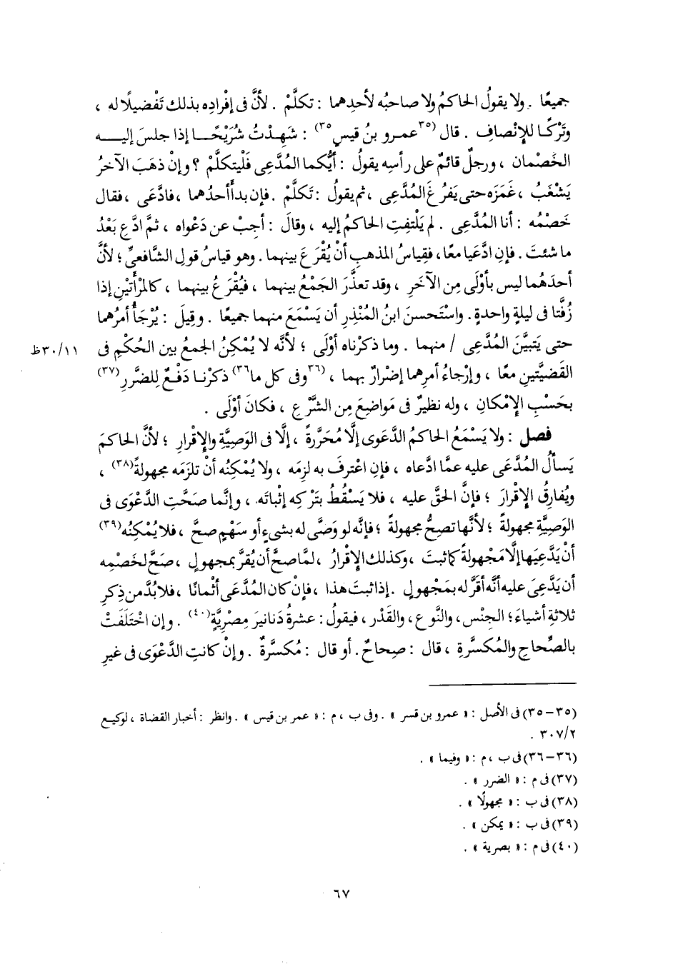 فصل: ولا يَسْمَعُ الحاكمُ الدَّعَوى إلَّا مُحَرَّرةً، إلَّا فى الوَصِيَّةِ والإِقْرارِ؛ لأنَّ الحاكمَ يَسألُ المُدَّعَى عليه عمَّا ادَّعاه، فإنِ اعْترفَ به لزِمَه، ولا يُمْكِنُه أنْ تلزَمَه مجهولةً (٣٨)، ويُفارِقُ الإِقْرارَ، فإنَّ الحقَّ عليه، فلا يَسْقُطُ بتَرْكِه إثْباتَه، وإنَّما صَحَّتِ الدَّعْوَى فى الوَصِيَّةِ مجهولةً؛ لأنَّها تصِحُّ مجهولةً؛ فإنَّه لو وَصَّى له بشىءٍ أو سَهْمٍ صحَّ، فلا يُمْكِنُه (٣٩) أنْ يَدَّعِيَها إِلَّا مَجْهولةً كما ثبتَ، وكذلك الإِقْرارُ، لمَّا صحَّ أن يُقرَّ بمجهولٍ، صَحَّ لخَصْمِه أن يَدَّعِىَ عليه أنَّه أقَرَّ له بمَجْهولٍ. إذا ثبتَ هذا، فإنْ كان المُدَّعَى أثْمانًا، فلا بُدَّ من ذِكرِ ثلاثةِ أشياءَ؛ الجِنْس، والنَّوع، والقَدْر، فيقولُ: عشرةُ دَنانيرَ مِصْرِيَّةٍ (٤٠). وإن اخْتَلَفَتْ بالصِّحاحِ والمُكسَّرةِ، قال: صِحاحٌ. أو قال: مُكسَّرةٌ. وإنْ كانتِ الدَّعْوَى فى غيرِ
