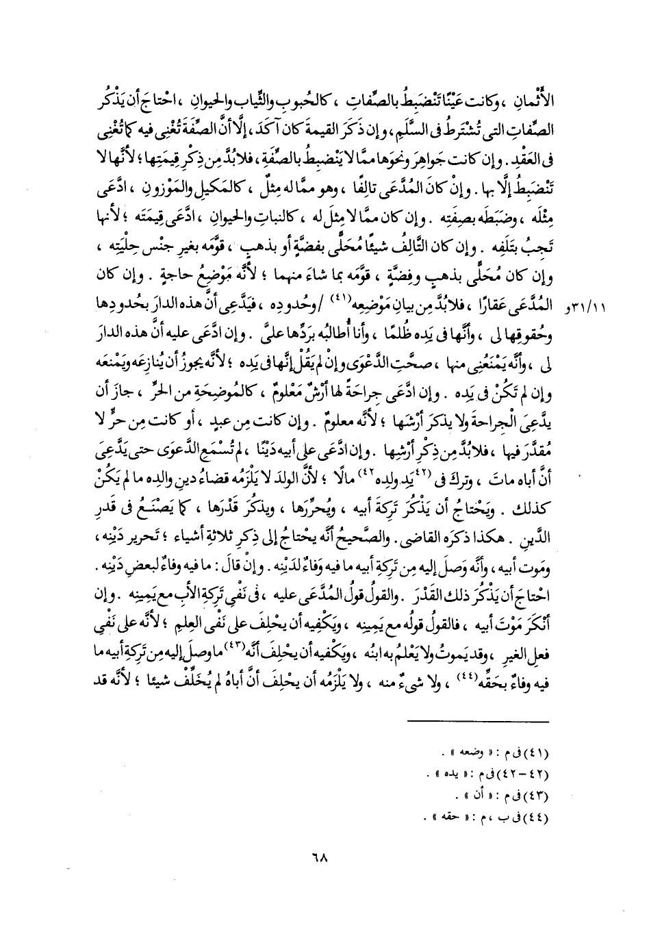 الأَثْمانِ، وكانت عَيْنًا تَنْضَبِطُ بالصِّفاتِ، كالحُبوبِ والثِّياب والحيوانِ، احْتاجَ أن يَذْكُر الصِّفاتِ التى تُشْتَرطُ فى السَّلَمِ، وإن ذَكَرَ القيمةَ كان آكَدَ، إلَّا أنَّ الصِّفَةَ تُغْنِى فيه كما تُغْنِى فى العَقْدِ. وإن كانت جَواهِرَ ونحوَها ممَّا لا يَنْضبِطُ بالصِّفَةِ، فلابُدَّ مِن ذِكْرِ قِيمَتِها؛ لأنَّها لا تَنْضَبِطُ إلَّا بها. وإنْ كانَ المُدَّعَى تالِفًا، وهو ممَّا له مِثلٌ، كالمَكيلِ والمَوْزونِ، ادَّعَى مِثْلَه، وضَبَطَه بصِفَتِه. وإن كان ممَّا لا مِثلَ له، كالنباتِ والحيوانِ، ادَّعَى قِيمَتَه؛ لأنها تَجِبُ بتَلَفِه. وإن كان التَّالِفُ شيئًا مُحَلًّى بفضَّةٍ أو بذهبٍ، قوَّمَه بغيرِ جنْس حِلْيَتِه، وإن كان مُحَلًّى بذهبٍ وفِضَّةٍ، قوَّمَه بما شاءَ منهما؛ لأنَّه مَوْضِعُ حاجةٍ. وإن كان المُدَّعَى عَقارًا، فلابُدَّ مِن بيانِ مَوْضِعِه (٤١) وحُدودِه، فيَدَّعِى أنَّ هذه الدارَ بحُدودِها وحُقوقِها لى، وأنَّها فى يَدِه ظُلمًا، وأنا أُطالبُه برَدِّها علىَّ. وإن ادَّعَى عليه أنَّ هذه الدارَ لى، وأنَّه يَمْنَعُنِى منها، صحَّتِ الدَّعْوَى وإنْ لم يَقُلْ إنَّها فى يَدِه؛ لأنَّه يجوزُ أن يُنازِعَه ويَمْنعَه وإن لم تَكُنْ فى يَدِه. وإن ادَّعَى جِراحَةً لها أرْشٌ مَعْلومٌ، كالمُوضِحَةِ من الحرِّ، جازَ أن يدَّعِىَ الْجِراحةَ ولا يذكرَ أرْشَها؛ لأنَّه معلومٌ. وإن كانت مِن عبدٍ، أو كانت مِن حرٍّ لا مُقدَّرَ فيها، فلابُدَّ مِن ذِكْرِ أرْشِها. وإن ادَّعَى على أبيه دَيْنًا، لم تُسْمَعِ الدَّعوَى حتى يَدَّعِىَ أنَّ أباه ماتَ، وتركَ فى [يَدِ ولدِه] (٤٢) مالًا؛ لأنَّ الولدَ لا يَلْزَمُه قضاءُ دينِ والدِه ما لم يَكُنْ كذلك. ويَحْتاجُ أن يَذْكُرَ تَرِكَةَ أبيه، ويُحرِّرَها، ويذكُرَ قَدْرَها، كما يَصْنَعُ فى قَدرِ الدَّينِ. هكذا ذكرَه القاضى. والصَّحيحُ أنَّه يحْتاجُ إلى ذِكرِ ثلاثةِ أشياء؛ تَحرير دَيْنِه، ومَوت أبيه، وأنَّه وَصلَ إليه مِن تَرِكةِ أبيه ما فيه وَفاءٌ لدَيْنِه. وإنْ قالَ: ما فيه وفاءٌ لبعضِ دَيْنِه. احْتاجَ أن يَذْكُرَ ذلك القَدْرَ. والقولُ قولُ المُدَّعَى عليه، فى نَفْىِ تَرِكةِ الأبِ مع يَمِينِه. وإن أنْكَرَ مَوْتَ أبيه، فالقولُ قولُه مع يَمِينِه، ويَكْفِيه أن يحْلِفَ على نَفْى العِلمِ؛ لأنَّه على نَفْى فعلِ الغيرِ، وقد يَموتُ ولا يَعْلمُ به ابنُه، ويَكْفيه أن يحْلِفَ أنَّه (٤٣) ما وصلَ إليه مِن تَرِكةِ أبيه ما فيه وفاءٌ بحَقِّه (٤٤)، ولا شىءٌ منه، ولا يَلْزَمُه أن يحْلِفَ أنَّ أباهُ لم يُخَلِّفْ شيئا؛ لأنَّه قد