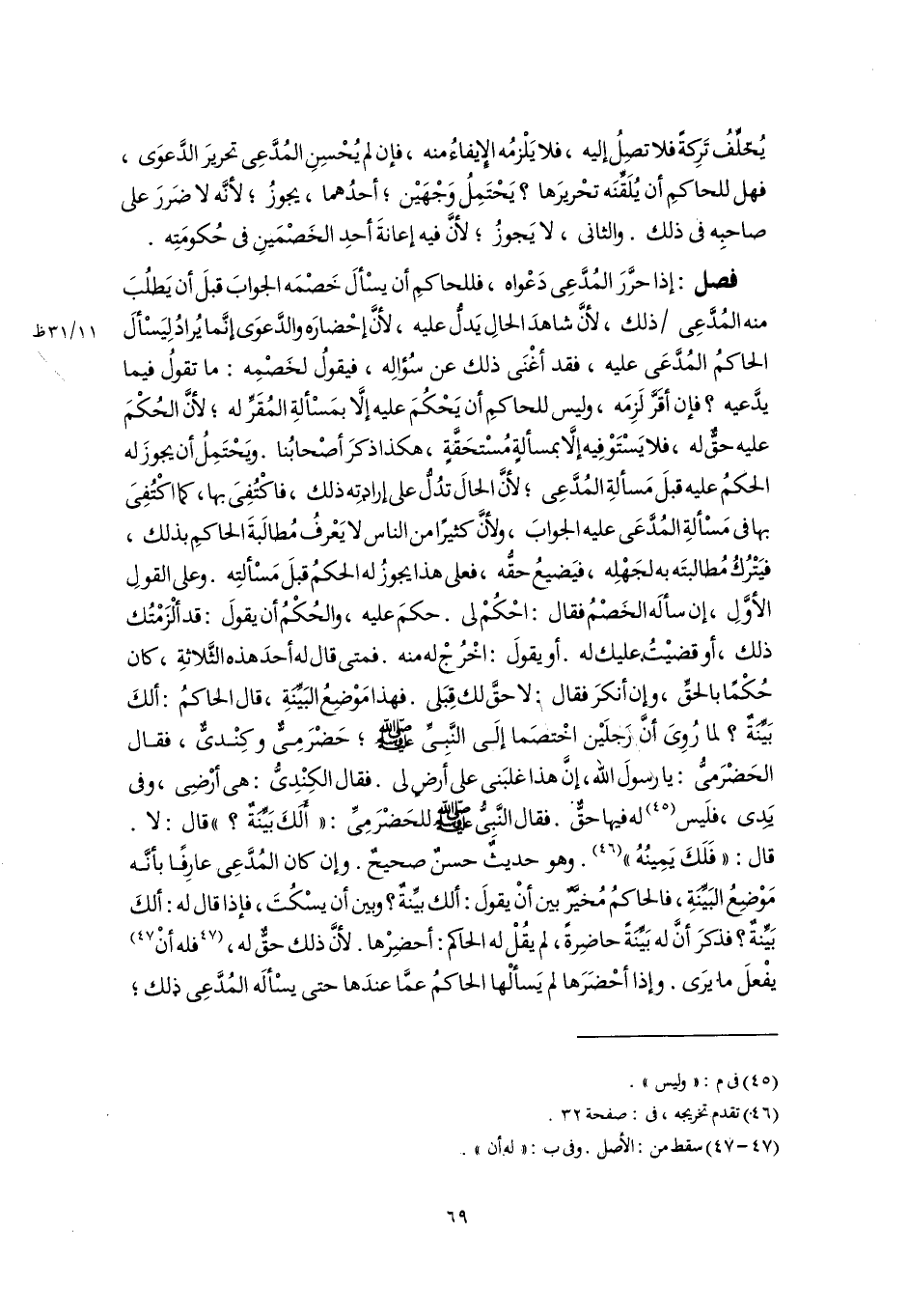 فصل: إذا حرَّرَ المُدَّعِى دَعْواه، فللحاكمِ أن يسْألَ خَصْمَه الجوابَ قبلَ أن يَطلُبَ منه المُدَّعِى ذلك؛ لأنَّ شاهدَ الحالِ يَدلُّ عليه؛ لأنَّ إحْضارَه والدَّعوَى إنَّما يُرادُ لِيَسْألَ الحاكمُ المُدَّعَى عليه، فقد أغْنَى ذلك عن سُؤالِه، فيقولُ لخَصْمِه: ما تقولُ فيما يدَّعيه؟ فإن أقَرَّ لَزِمَه، وليس للحاكمِ أن يَحْكُمَ عليه إلَّا بمَسْألةِ المُقَرِّ له؛ لأنَّ الحُكْمَ عليه حقٌّ له، فلا يَسْتَوْفِيه إلَّا بمسألةٍ مُسْتحَقَّةٍ، هكذا ذكرَ أصْحابُنا. ويَحْتَمِلُ أن يجوزَ له الحكمُ عليه قبلَ مَسألةِ المُدَّعِى؛ لأنَّ الحالَ تدُلُّ على إرادتِه ذلك، فاكْتُفِىَ بها، كما اكْتُفِىَ بها فى مَسْألةِ المُدَّعَى عليه الجوابَ، ولأنَّ كثيرًا من الناس لا يَعْرفُ مُطالَبةَ الحاكِم بذلك، فيَتْرُكُ مُطالبتَه به لجَهْلِه، فيَضيعُ حقُّه، فعلى هذا يجوزُ له الحكمُ قبلَ مَسْألتِه. وعلى القولِ الأوَّلِ، إن سألَه الخَصْمُ فقال: احْكُمْ لى. حكمَ عليه، والحُكْمُ أن يقولَ: قد ألْزَمْتُك ذلك، أو قضيْتُ عليك له. أو يقولَ: اخْرُجْ له منه. فمتى قال له أحدَ هذه الثَّلاثةِ، كان حُكْمًا بالحقِّ، وإن أنكرَ فقال: لا حقَّ لك قِبَلى. فهذا مَوْضِعُ البَيِّنةِ، قال الحاكمُ: ألكَ بَيِّنَةٌ؟ لما رُوِىَ أنَّ رَجلَيْن اخْتصَما إلَى النَّبىِّ -صَلَّى اللهُ عَلَيْهِ وَسَلَّمَ-؛ حَضْرَمِىٌّ وكِنْدىٌّ، فقال الحَضْرَمىُّ: يا رسولَ اللَّه، إنَّ هذا غلبَنى على أَرضٍ لى. فقال الكِنْدِىُّ: هى أرْضِى، وفى يَدِى، فلَيس (٤٥) له فيها حقٌّ. فقال النَّبىُّ -صَلَّى اللهُ عَلَيْهِ وَسَلَّمَ- للحَضْرَمِىِّ: "أَلَكَ بَيِّنَةٌ؟ " قال: لا. قال: "فَلَكَ يَمِينُهُ" (٤٦). وهو حديثٌ حسنٌ صحيحٌ. وإن كان المُدَّعِى عارِفًا بأنَّه مَوْضِعُ البَيِّنَةِ، فالحاكمُ مُخيَّرٌ بين أنْ يقولَ: ألك بيِّنةٌ؟ وبين أن يسْكُتَ، فإذا قال له: ألكَ بَيِّنَةٌ؟ فذكرَ أنَّ له بَيِّنَةً حاضِرةً، لم يقُلْ له الحاكم: أحضِرْها. لأنَّ ذلك حقٌّ له، [فله أنْ] (٤٧) يفْعلَ ما يرَى. وإذا أحْضَرَها لم يَسألْها الحاكمُ عمَّا عندَها حتى يسْألَه المُدَّعِى ذلك؛