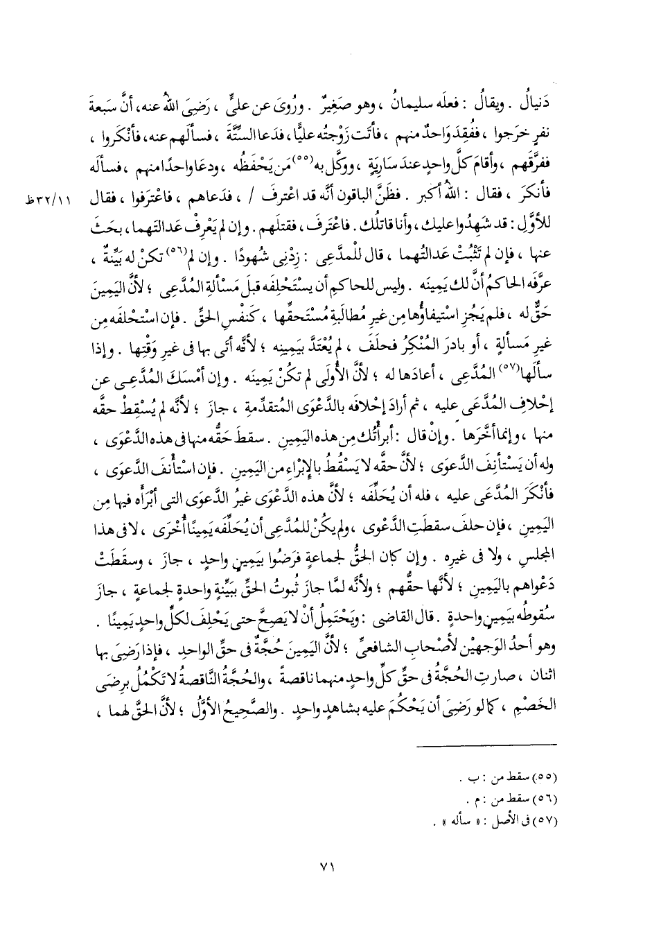 دَنيالُ. ويقالُ: فعلَه سليمانُ، وهو صَغِيرٌ. ورُوىَ عن علىٍّ، رَضِىَ اللهُ عنه، أنَّ سَبعةَ نفرٍ خرَجوا، ففُقِدَ وَاحدٌ منهم، فأتَت زَوْجتُه عليًّا، فدَعا السِّتَّةَ، فسألَهم عنه، فأنْكَروا، ففرَّقَهم، وأقامَ كلَّ واحدٍ عندَ سَارِيَةٍ، ووكَّل به (٥٥) مَن يَحْفَظُه، ودعَا واحدًا منهم، فسألَه فأنكرَ، فقال: اللهُ أكبر. فظَنَّ الباقون أنَّه قد اعْترفَ، فدَعاهم، فاعْترَفوا، فقال للأوَّلِ: قد شَهِدُوا عليك، وأنا قاتلُك. فاعْتَرفَ، فقتلَهم. وإن لم يَعْرِفْ عَدالتَهما، بحَثَ عنها، فإن لم تَثْبُتْ عَدالتُهما، قال للْمدَّعِى: زِدْنِى شُهودًا. وإن لم (٥٦) تكنْ له بَيِّنةٌ، عرَّفَه الحاكمُ أنَّ لك يَمِينَه. وليس للحاكِم أن يسْتَحْلِفَه قبلَ مَسْألةِ المُدَّعِى؛ لأنَّ اليَمِينَ حَقٌّ له، فلم يَجُزِ اسْتيفاؤُها مِن غيرِ مُطالَبةِ مُسْتَحقِّها، كَنفْسِ الحقِّ. فإن اسْتحْلفَه مِن غيرِ مَسألةٍ، أو بادرَ المُنْكِرُ فحلَفَ، لم يُعْتَدَّ بيَمِينِه؛ لأنَّه أتَى بها فى غيرِ وَقْتِها. وإذا سألَها (٥٧) المُدَّعِى، أعادَها له؛ لأنَّ الأولَى لم تكُنْ يَمِينَه. وإن أمْسَكَ المُدَّعِى عن إحْلافِ المُدَّعَى عليه، ثم أرادَ إحْلافَه بالدَّعْوَى المُتقدِّمةِ، جازَ؛ لأنَّه لم يُسْقِطْ حقَّه منها، وإنما أخَّرَها. وإنْ قال: أبرأْتُك مِن هذه اليَمِينِ. سقطَ حَقُّه منها فى هذه الدَّعْوَى، وله أن يَسْتأنِفَ الدَّعوَى؛ لأنَّ حقَّه لا يَسْقُطُ بالإِبرْاءِ من اليَمِينِ. فإن اسْتأْنفَ الدَّعوَى، فأنْكَرَ المُدَّعَى عليه، فله أن يُحَلِّفَه؛ لأنَّ هذه الدَّعْوَى غيرُ الدَّعوَى التى أبْرَأَه فيها مِن اليَمِينِ، فإن حلفَ سقطَتِ الدَّعْوى، ولم يكُنْ للمُدَّعِى أن يُحَلِّفَه يَمِينًا أُخْرَى، لا فى هذا المجلسِ، ولا فى غيرِه. وإن كان الحقُّ لجماعةٍ فرَضُوا بيَمِينٍ واحدٍ، جازَ، وسقَطَتْ دَعْواهم باليَمِينِ؛ لأنَّها حقُّهم؛ ولأنَّه لمَّا جازَ ثُبوتُ الحقِّ ببَيِّنةٍ واحدةٍ لجماعةٍ، جازَ سُقوطُه بيَمِينٍ واحدةٍ. قال القاضى: ويَحْتَمِلُ أنْ لا يَصِحَّ حتى يَحْلِفَ لكلِّ واحدٍ يَمِينًا. وهو أحدُ الوَجهيْن لأصْحابِ الشافعىِّ؛ لأنَّ اليَمِينَ حُجَّةٌ فى حقِّ الواحدِ، فإذا رَضِىَ بها اثنان، صارتِ الحُجَّةُ فى حقِّ كلِّ واحدٍ منهما ناقصةً، والحُجَّةُ النَّاقصةُ لا تَكْمُلُ برِضَى الخَصْمِ، كما لو رَضِىَ أن يَحْكُمَ عليه بشاهدٍ واحدٍ. والصَّحِيحُ الأوَّلُ؛ لأنَّ الحقَّ لهما،
