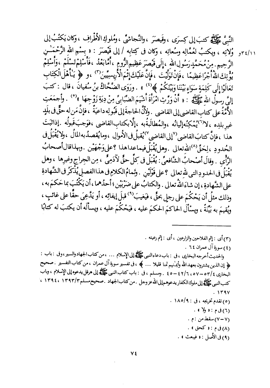 النَّبِىَّ -صَلَّى اللهُ عَلَيْهِ وَسَلَّمَ- كتبَ إلى كِسرَى، وقَيصَرَ، والنَّجاشىِّ، ومُلوكِ الأطْرافِ، وكان يَكتُبُ إلى وُلاتِه، ويكتبُ لعُمَّالِه وسُعاتِه، وكان فى كِتابِه إلى قَيْصَرَ: "بِسْمِ اللهِ الرَّحْمَنِ الرَّحِيمِ. مِنْ مُحَمَّدٍ رَسُولِ اللهِ، إلَى قَيْصَرَ عَظِيمِ الرُّومِ، أمَّا بَعْدُ، فَأَسْلِمْ تَسْلَمْ، وَأَسْلِمْ يُؤْتِكَ اللهُ أَجْرًا عَظِيمًا، فَإِنْ تَوَلَّيْتَ، فَإِنَّ عَلَيْكَ إِثْمَ الْأرِيسِيِّينَ (٣)، و {يَاأَهْلَ الْكِتَابِ تَعَالَوْا إِلَى كَلِمَةٍ سَوَاءٍ بَيْنَنَا وَبَيْنَكُمْ} (٤) ". ورَوَى الضَّحَّاكُ بنُ سُفيانَ، قال: كتبَ إلىَّ رسولُ اللهِ -صَلَّى اللهُ عَلَيْهِ وَسَلَّمَ-: "أَنْ وَرِّثِ امْرَأَةَ أَشْيَمَ الضَّبَابِىِّ مِنْ دِيَةِ زَوْجِهَا" (٥). وأجمَعَتِ الأُمَّةُ على كتابِ القاضى إلى القاضى. ولأنَّ الحاجةَ إلى قَبُولِه داعيَةٌ، فإنَّ مَن له حقٌّ فى بلَدٍ غيرِ بلدِه، لا (٦) يُمْكِنُه إتْيانُه، والمُطالَبةُ به، إلَّا بكتابِ القاضى، فوَجبَ قَبولُه. إذا ثبَتَ هذا، فإنَّ كتابَ القاضى [إلى القاضى] (٧) يُقبلُ فى الأموالِ، وما يُقصدُ به المالُ، ولا يُقْبَلُ فى الحُدودِ، لِحَقِّ (٨) اللهِ تعالى. وهل يُقْبَلُ فيما عدا هذا؟ على وَجْهَيْن. وبهذا قال أصحابُ الرَّأْىِ. وقالَ أصْحابُ الشَّافعىِّ: يُقْبَلُ فى كلِّ حقٍّ لآدَمِىٍّ، مِن الجِراحِ وغيرِها، وهل يُقْبَلُ فى الحدودِ التى للهِ تعالى؟ على قَوْلَيْنِ. وتَمامُ الكلامِ فى هذا الفصلِ يُذْكَرُ فى الشَّهادةِ على الشَّهادةِ، إن شاءَ اللهُ تعالى. والكتابُ على ضَرْبَيْن، أحدُهما، أن يَكْتُبَ بما حَكمَ به، وذلك مثلُ أن يَحْكُمَ على رجلٍ بحقٍّ، فيَغيبَ (٩) قبلَ إيفائِه، أو يَدَّعِىَ حقًّا على غائبٍ، ويُقيمَ به بَيِّنَةً، ويسْألَ الحاكمَ الحكمَ عليه، فيَحْكُمَ عليه، ويسألَه أن يكتبَ له كتابًا