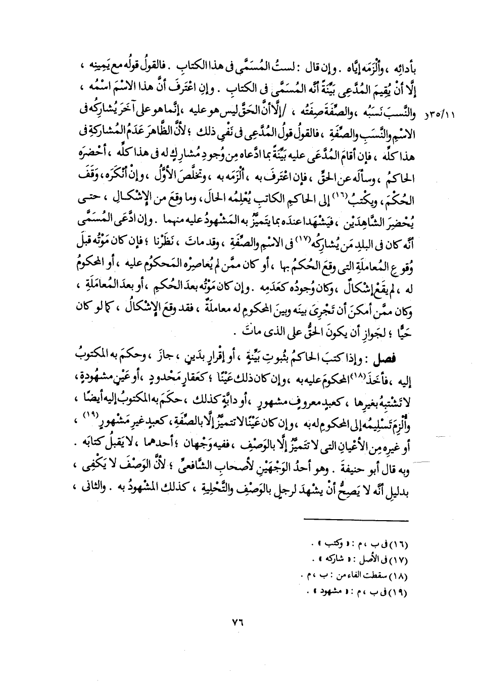 بأدائِه، وألْزَمَه إيَّاه. وإن قال: لستُ المُسَمَّى فى هذا الكتابِ. فالقولُ قولُه مع يَمِينِه، إلَّا أنْ يُقِيمَ المُدَّعِى بَيِّنَةً أنَّه المُسَمَّى فى الكتابِ. وإنِ اعْتَرفَ أنَّ هذا الاسْمَ اسْمُه، والنَّسبَ نَسَبُه، والصِّفَةَ صِفَتُه، إِلَّا أنَّ الحَقَّ ليس هو عليه، إنَّما هو على آخَرَ يُشارِكُه فى الاسْمِ والنَّسَبِ والصِّفَةِ، فالقولُ قولُ المُدَّعِى فى نَفْىِ ذلك؛ لأنَّ الظَّاهرَ عَدَمُ المُشاركةِ فى هذا كلِّه، فإن أقامَ المُدَّعَى عليه بَيِّنَةً بما ادَّعاه مِن وُجودِ مُشارِكٍ له فى هذا كلِّه، أحْضرَه الحاكمُ، وسألَه عن الحقِّ، فإن اعْتَرفَ به، ألْزَمَه به، وتخلَّصَ الأوَّلُ، وإنْ أنْكَرَه، وَقَفَ الحُكْمَ، ويكْتبُ (١٦) إلى الحاكمِ الكاتبِ يُعْلِمُه الحالَ، وما وقعَ من الإشْكالِ، حتى يُحْضِرَ الشَّاهِدَيْن، فيَشْهَدا عندَه بما يتَميَّزُ به المَشْهودُ عليه منهما. وإن ادَّعَى المُسَمَّى أنَّه كان فى البلدِ مَن يُشارِكُه (١٧) فى الاسْمِ والصِّفَةِ، وقد ماتَ، نَظَرْنا؛ فإن كان مَوْتُه قبلَ وُقوعِ المُعاملَةِ التى وقعَ الحُكمُ بها، أو كان ممَّن لم يُعاصِرْه المَحكومُ عليه، أو المحكومُ له، لم يقَعْ إشْكالٌ، وكان وُجودُه كعَدَمِه. وإن كان مَوْتُه بعدَ الحُكمِ، أو بعدَ المُعامَلَةِ، وكان ممَّن أمكنَ أن تَجْرِىَ بينَه وبينَ المحكومِ له معاملَةٌ، فقد وقعَ الإشْكالُ، كما لو كان حَيًّا؛ لجَوازِ أن يكونَ الحقُّ على الذى ماتَ.