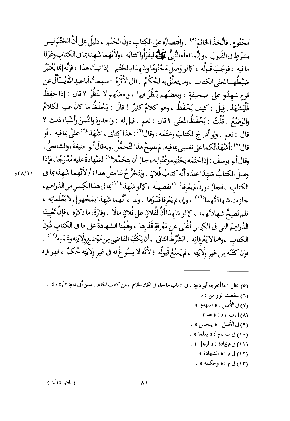 مَخْتُومٍ. فاتَّخذَ الخاتَمَ (٥). واقْتصارُه على الكِتابِ دونَ الخَتْمِ، دليلٌ على أنَّ الخَتْمَ ليس بشَرْطٍ فى القَبولِ، وإنَّما فعلَه النَّبِىُّ -صَلَّى اللهُ عَلَيْهِ وَسَلَّمَ- ليقْرَأُوا كتابَه، ولأنَّهما شَهِدَا بما فى الكتابِ وعَرَفا ما فيه، فوجَبَ قَبولُه، كما لو وَصلَ مَخْتُومًا وشَهِدَا بالخَتْمِ. إذا ثبتَ هذا، فإنَّه إنما يُعْتبَرُ ضَبْطُهما لمعنَى الكتابِ، وما يتعلَّقُ به الحُكْمُ. قال الأثْرَمُ: سمِعتُ أبا عبدِ اللَّه يُسْأَلُ عن قومٍ شهِدُوا على صحيفةٍ، وبعضُهم يَنْظُرُ فيها، وبعضُهم لا ينْظُرُ؟ قال: إذا حفِظَ فَلْيَشْهَدْ. قِيلَ: كيف يَحْفَظُ، وهو كلامٌ كثيرٌ! قالَ: يَحْفَظُ ما كانَ عليه الكلامُ والوَضْعُ. قُلْتُ: يَحْفَظُ المعنَى؟ قال: نعم. قيل له: والحدودَ والثَّمنَ وأشْباهَ ذلك؟ قال: نعم. ولو أدرجَ الكتابَ وختَمَه، وقال (٦): هذا كِتابى، اشْهَدَا (٧) علىَّ بما فيه. أو قال (٨): أشْهَدْتُكما على نفسِى بما فيه. لم يصِحَّ هذا التَّحمُّلُ. وبه قالَ أبو حنيفةَ، والشافعىُّ. وقال أبو يوسفَ: إذا خَتَمَه بخَتْمِه وعُنْوانِه، جازَ أن يتحَمَّلا (٩) الشَّهادةَ عليه مُدْرَجًا، فإذا وصلَ الكتابُ شَهِدَا عندَه أنَّه كتابُ فُلانٍ. ويَتَخَرَّجُ لنا مثلُ هذا؛ لأنَّهما شَهِدَا بما فى الكتابِ، فجازَ، وإنْ لم يعْرِفا (١٠) تفصِيلَه، كما لو شَهِدَا (١١) بما فى هذا الكِيسِ من الدَّراهمِ، جازت شهادَتُهما (١٢)، وإن لم يَعْرِفا قَدْرَها. ولَنا، أَنَّهما شَهِدَا بمَجْهولٍ لا يَعْلَمانِه، فلم تَصِحَّ شهادتُهما، كما لو شَهِدَا أنَّ لفُلانٍ على فُلانٍ مالًا. وفارَقَ ما ذكرَه، فإنَّ تعْيِينَه الدَّراهِمَ التى فى الكِيس أغْنَى عن مَعْرفةِ قَدْرِها، وهاهُنا الشهادةُ على ما فى الكتابِ دُونَ الكتابِ، وهما لا يَعْرِفانِه. الشَّرْطُ الثانى، أن يَكْتُبَه القاضى مِن مَوْضعِ وِلايَتِه وعَمَلِه (١٣)، فإن كتَبَه مِن غيرِ وِلايَتِه، لم يَسُغْ قَبولُه؛ لأنَّه لا يسُوغُ له فى غيرِ وِلايَتِه حُكمٌ، فهو فيه