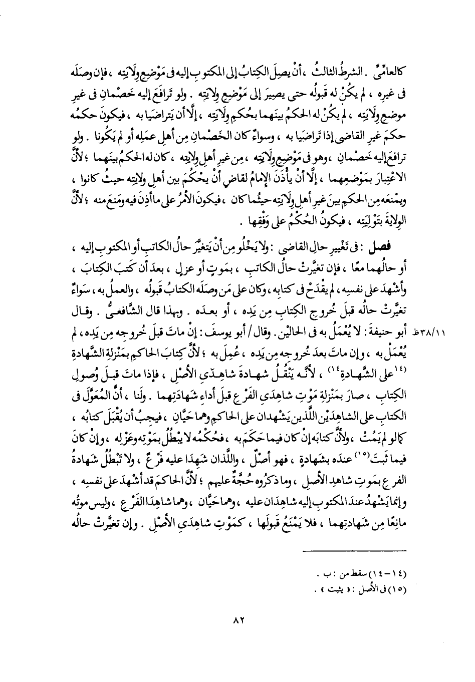 فصل: فى تَغْييرِ حالِ القاضى: ولا يَخْلُو مِن أنْ يَتغيَّرَ حالُ الكاتبِ أو المكتوبِ إليه، أو حالُهما معًا، فإن تغيَّرتْ حالُ الكاتبِ، بمَوتٍ أو عزلٍ، بعدَ أَن كَتبَ الكِتابَ، وأشْهدَ على نفسِه، لم يقْدَحْ فى كتابِه، وكان على مَن وصَلَه الكتابُ قَبولُه، والعملُ به، سَواءٌ تغيَّرتْ حالُه قبلَ خُروجِ الكِتابِ مِن يَدِه، أو بعدَه. وبهذا قال الشَّافعىُّ. وقال أبو حنيفةَ: لا يُعْمَلُ به فى الحاليْن. وقال أبو يوسفَ: إنْ ماتَ قبلَ خُروجِه مِن يَدِه، لم يُعْمَلْ به، وإن ماتَ بعدَ خُروجِه مِن يَدِه، عُمِلَ به؛ لأنَّ كِتابَ الحاكمِ بمَنْزلةِ الشَّهادةِ [على الشَّهادةِ] (١٤)؛ لأنَّه يَنْقُلُ شهادةَ شاهِدَىِ الأصْلِ، فإذا ماتَ قبلَ وُصولِ الكِتابِ، صارَ بمَنْزلةِ مَوْتِ شاهِدَىِ الفَرْعِ قبلَ أداءِ شَهادَتِهما. ولَنا، أنَّ المُعَوَّلَ فى الكتابِ على الشاهِدَيْن اللَّذين يَشْهدان على الحاكمِ وهما حَيَّانِ، فيجِبُ أن يُقْبَلَ كتابُه، كما لو لم يَمُتْ، ولأنَّ كتابَه إنْ كان فيما حَكَمَ به، فحُكْمُه لا يبْطُلُ بمَوْتِه وعَزْلِه، وإنْ كانَ فيما ثَبتَ (١٥) عندَه بشَهادةٍ، فهو أصْلٌ، واللَّذان شَهِدَا عليه فرْعٌ، ولا تَبْطُلُ شَهادةُ الفرعِ بمَوتِ شاهدِ الأصلِ، وما ذكرُوه حُجَّةٌ عليهم؛ لأنَّ الحاكمَ قد أشْهدَ على نفسِه، وإنما يَشْهدُ عندَ المكتوبِ إليه شاهِدَان عليه، وهما حَيَّان، وهما شاهِدَا الفَرْعِ، وليس موتُه مانِعًا مِن شَهادتِهما، فلا يَمْنَعُ قَبولَها، كمَوْتِ شاهِدَىِ الأصْلِ. وإن تغيَّرتْ حالُه