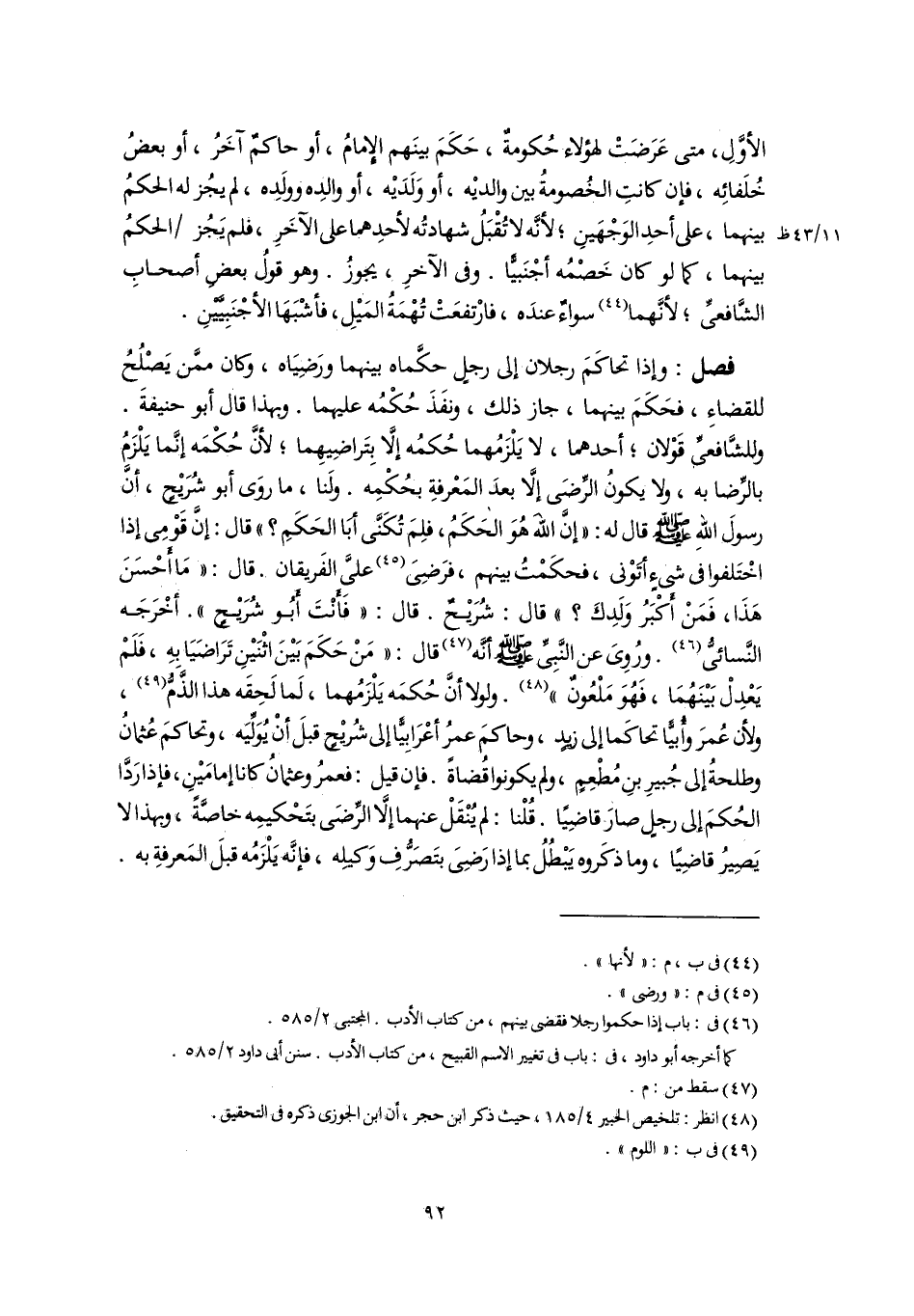 فصل: وإذا تحاكَمَ رجلان إلى رجلٍ حكَّماه بينهما ورَضِيَاه، وكان ممَّن يَصْلُحُ للقضاءِ، فحَكَمَ بينهما، جاز ذلك، ونفَذَ حُكْمُه عليهما. وبهذا قال أبو حنيفةَ. وللشَّافعىِّ قَوْلان؛ أحدهما، لا يَلْزَمُهما حُكمُه إلَّا بتَراضِيهِما؛ لأنَّ حُكْمَه إنَّما يَلْزَمُ بالرِّضا به، ولا يكونُ الرِّضَى إلَّا بعدَ المَعْرفةِ بحُكْمِه. ولَنا، ما روَى أبو شُرَيْحٍ، أنَّ رسولَ اللهِ -صَلَّى اللهُ عَلَيْهِ وَسَلَّمَ- قال له: "إنَّ اللهَ هُوَ الحَكَمُ، فلِمَ تُكَنَّى أَبَا الحَكَمِ؟ " قال: إنَّ قَوْمِى إذا اخْتَلفوا فى شىءٍ أتُوْنى، فحكَمْتُ بينهم، فرَضِىَ (٤٥) علىَّ الفَريقان. قال: "مَا أَحسَنَ هَذَا، فَمَنْ أكبَرُ وَلَدِكَ؟ " قال: شُرَيْحٌ. قال: "فَأنْتَ أبُو شُرَيْحٍ". أخْرَجَه النَّسائىُّ (٤٦). ورُوِىَ عن النَّبِىِّ -صَلَّى اللهُ عَلَيْهِ وَسَلَّمَ- أنَّه (٤٧) قال: "مَنْ حَكَمَ بَيْنَ اثْنَيْنِ تَرَاضَيَا بِهِ، فَلَمْ يَعْدِلْ بَيْنَهُمَا، فَهُوَ مَلْعُونٌ" (٤٨). ولولا أنَّ حُكمَه يَلْزَمُهما، لَما لَحِقَه هذا الذَّمُّ (٤٩)، ولأن عُمرَ وأُبيًّا تحاكَما إلى زيدٍ، وحاكمَ عمرُ أعْرَابِيًّا إلى شُريْحٍ قبلَ أنْ يُوَلِّيَه، وتحاكمَ عُثمانُ وطلحةُ إلى جُبيرِ بنِ مُطْعِمٍ، ولم يكونوا قُضاةً. فإن قيل: فعمرُ وعثمانُ كانا إمامَيْنِ، فإذا رَدَّا الحُكمَ إلى رجلٍ صارَ قاضِيًا. قُلْنا: لم يُنْقَلْ عنهما إلَّا الرِّضَى بتَحْكيمِه خاصَّةً، وبهذا لا يَصِيرُ قاضِيًا، وما ذكَروه يَبْطُلُ بما إذا رَضِىَ بتَصَرُّفِ وَكيله، فإنَّه يَلْزَمُه قبلَ المَعرفةِ به.