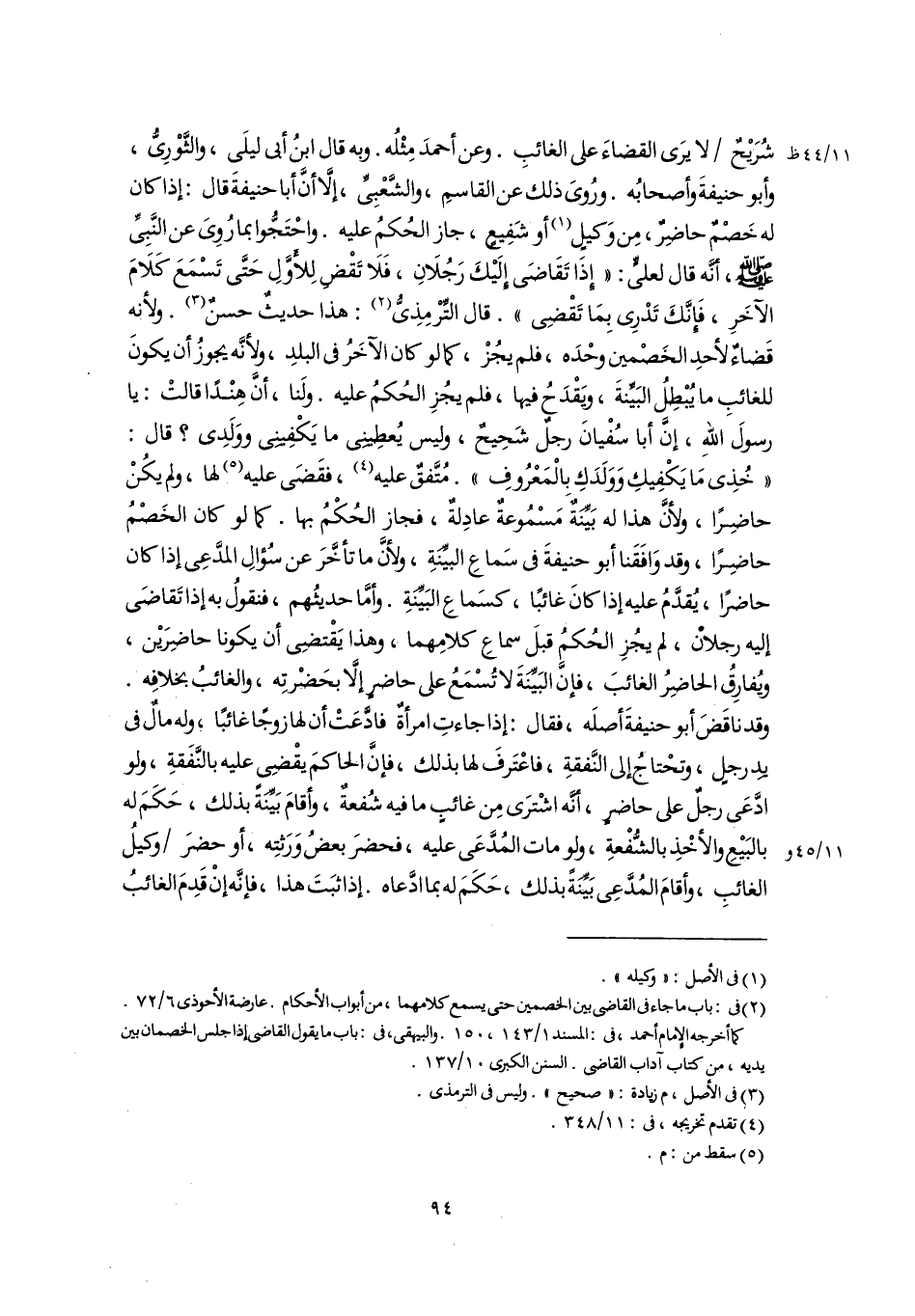 شُرَيْحٌ لا يرَى القضاءَ على الغائبِ. وعن أحمدَ مِثْلُه. وبه قال ابنُ أبي ليلَى، والثَّوْرِيُّ، وأبو حنيفةَ وأصحابُه. ورُويَ ذلك عن القاسمِ، والشَّعْبِيِّ، إلَّا أنَّ أبا حنيفةَ قال: إذا كان له خَصْمٌ حاضِرٌ، مِن وَكيلٍ (١) أو شَفِيعٍ، جاز الحُكمُ عليه. واحْتَجُّوا بما رُوِىَ عن النَّبِيِّ -صَلَّى اللهُ عَلَيْهِ وَسَلَّمَ-، أنَّه قال لعليٍّ: "إذَا تَقَاضَى إلَيْكَ رَجُلَانِ، فَلَا تَقْضِ لِلأوَّلِ حتَّى تَسْمَعَ كَلَامَ الآخَرِ، فَإنَّكَ تَدْرِى بِمَا تَقْضِي". قال التِّرْمِذِىُّ (٢): هذا حديثٌ حسنٌ (٣). ولأنه قَضاءٌ لأحدِ الخَصْمين وحْدَه، فلم يجُزْ، كما لو كان الآخَرُ فى البلدِ، ولأنَّه يجوزُ أن يكونَ للغائبِ ما يُبْطِلُ البَيِّنةَ، ويَقْدَحُ فيها، فلم يجُزِ الحُكمُ عليه. ولَنا، أنَ هِنْدًا قالتْ: يا رسولَ اللهِ، إنَّ أبا سُفْيانَ رجلٌ شَحِيحٌ، وليس يُعطِينِى ما يَكْفِينِى ووَلَدِى؟ قال: "خُذِى مَا يَكْفِيكِ وَوَلَدَكِ بِالْمَعْرُوفِ". مُتَّفقٌ عليه (٤)، فقَضَى عليه (٥) لها، ولم يكُنْ حاضِرًا، ولأنَّ هذا له بَيِّنةٌ مَسْمُوعةٌ عادِلةٌ، فجاز الحُكْمُ بها. كما لو كان الخَصْمُ حاضِرًا، وقد وَافَقَنا أبو حنيفةَ فى سَماعِ البَيِّنةِ، ولأنَّ ما تأخَّرَ عن سُؤالِ المدَّعِى إذا كان حاضرًا، يُقدَّمُ عليه إذا كانَ غائبًا، كسَماعِ البَيِّنَةِ. وأمَّا حديثُهم، فنقولُ به إذا تَقاضَى إليه رجلان، لم يجُزِ الحُكمُ قبلَ سماعِ كلامِهما، وهذا يَقْتضِي أن يكونا حاضِرَيْن، ويُفارِقُ الحاضِرُ الغائبَ، فإنَّ البَيِّنَةَ لا تُسْمَعُ على حاضرٍ إلَّا بحَضْرتِه، والغائبُ بخلافِه. وقد ناقَضَ أبو حنيفةَ أصلَه، فقال: إذا جاءتِ امرأةٌ فادَّعَتْ أن لها زوجًا غائبًا، وله مالٌ فى يدِ رجلٍ، وتحْتاجُ إلى النَّفقةِ، فاعْتَرفَ لها بذلك، فإنَّ الحاكمَ يقْضِى عليه بالنَّفَقةِ، ولو ادَّعَى رجلٌ على حاضرٍ، أنَّه اشْترَى مِن غائبٍ ما فيه شُفعةٌ، وأقامَ بَيِّنَةً بذلك، حَكَمَ له بالبَيْعِ والأخْذِ بالشُّفْعةِ، ولو مات المُدَّعَى عليه، فحضرَ بعضُ وَرَثتِه، أو حضرَ وكيلُ الغائبِ، وأقامَ المُدَّعِى بَيِّنَةً بذلك، حَكَمَ له بما ادَّعاه. إذا ثبَتَ هذا، فإنَّه إنْ قَدِمَ الغائبُ