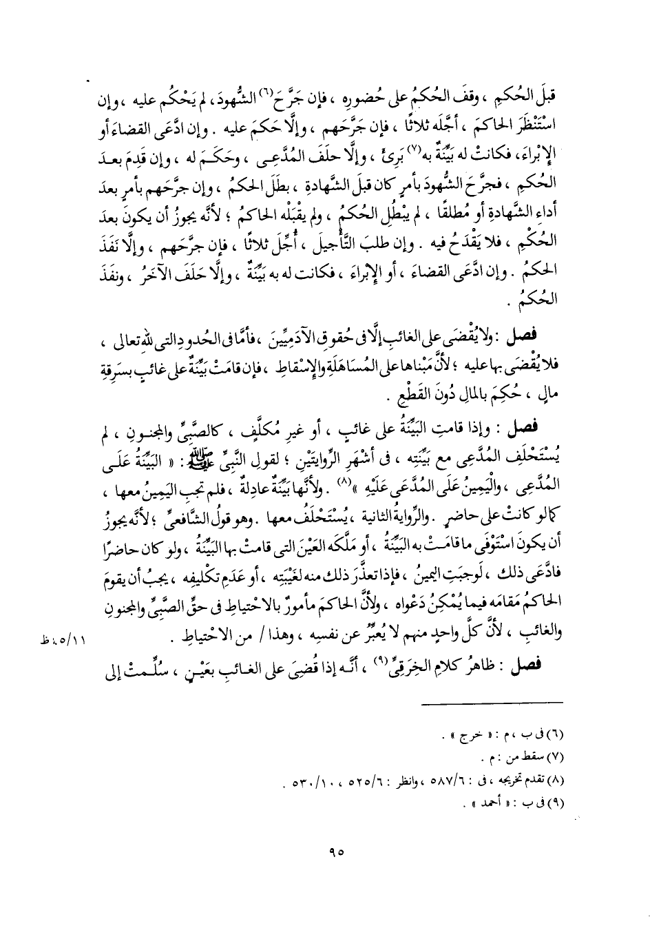 قبلَ الحُكمِ، وقفَ الحُكمُ على حُضورِه، فإن جَرَّحَ (٦) الشُّهودَ، لم يَحْكُم عليه، وإن اسْتَنْظَرَ الحاكمَ، أجَّلَه ثلاثًا، فإن جَرَّحَهم، وإلَّا حَكمَ عليه. وإن ادَّعَى القضاءَ أو الإبْراءَ، فكانتْ له بَيِّنَةٌ به (٧) بَرِئ، وإلَّا حلَفَ المُدَّعِى، وحَكَمَ له، وإن قَدِمَ بعدَ الحُكمِ، فجرَّحَ الشُّهودَ بأمرٍ كان قبلَ الشَّهادةِ، بطَلَ الحكمُ، وإن جرَّحَهم بأمرٍ بعدَ أداءِ الشَّهادةِ أو مُطلقًا، لم يبْطُلِ الحُكمُ، ولم يقْبَلْه الحاكمُ؛ لأنَّه يجوزُ أن يكونَ بعدَ الحُكْمِ، فلا يَقْدَحُ فيه. وإن طلبَ التَّأْجيلَ، أُجِّلَ ثلاثًا، فإن جرَّحَهم، وإلَّا نَفَذَ الحكمُ. وإن ادَّعَى القضاءَ، أو الإبراءَ، فكانت له به بَيِّنَةٌ، وإلَّا حَلَفَ الآخَرُ، ونفَذَ الحُكمُ.