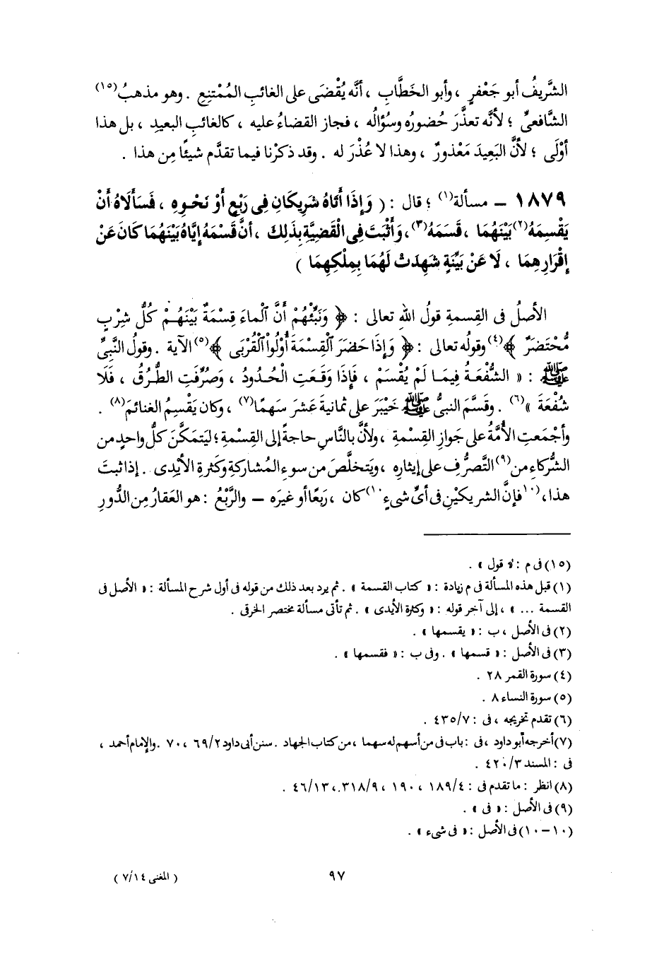 (١) قبل هذه المسألة في م زيادة: "كتاب القسمة". ثم ورد بعد ذلك من قوله في أول شرح المسألة: "الأصل في القسمة. . ."، إلى آخر قوله: "وكثرة الأيدى". ثم تأتى مسألة مختصر الخرقي.