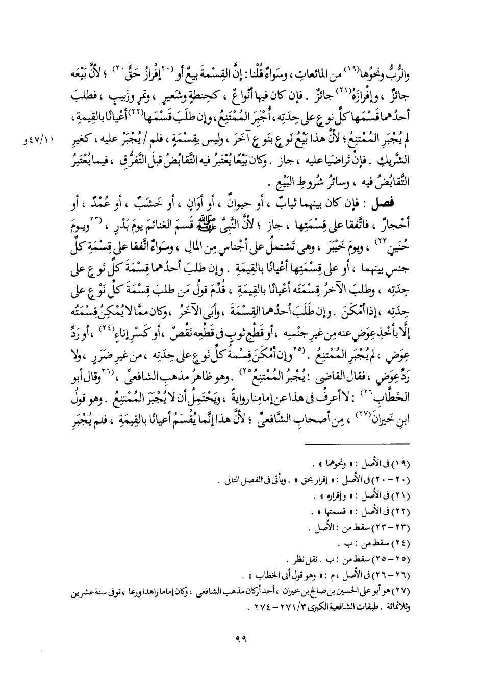 والرُّبُّ ونحوُها (١٩) من المائعاتِ، وسَواءٌ قُلْنا: إنَّ القِسْمةَ بيعٌ أو [إفْرازُ حَقٍّ] (٢٠)؛ لأنَّ بَيْعَه جائزٌ، وإفْرازَهُ (٢١) جائزٌ. فإن كان فيها أنْواعٌ، كحِنطةٍ وشَعيرٍ، وتمرٍ وزَبيبٍ، فطلبَ أحدُهما قَسْمَها كلَّ نوعٍ على حِدَتِه، أُجْبِرَ المُمْتَنِعُ، وإن طلَبَ قَسْمَها (٢٢) أعْيانًا بالقِيمةِ، لم يُجْبَرِ المُمْتَنِعُ؛ لأنَّ هذا بَيْعُ نَوعٍ بنَوعٍ آخَرَ، وليس بقِسْمَةٍ، فلم يُجْبَرْ عليه، كغيرِ الشَّريكِ. فإنْ تَراضَيا عليه، جاز. وكان بَيْعًا يُعْتَبرُ فيه التقابُضُ قبلَ التَّفرُّقِ، فيما يُعْتَبرُ التَّقابُضُ فيه، وسائرُ شُروطِ البَيْعِ.