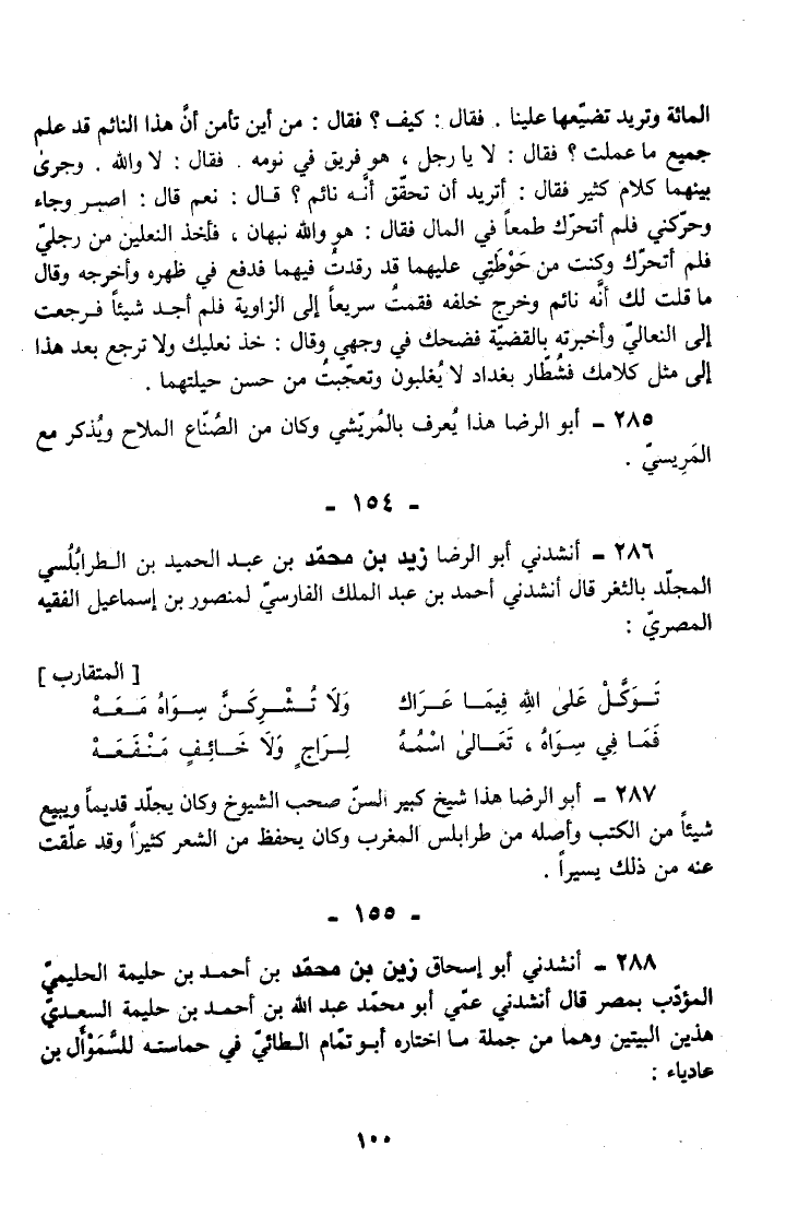 287 - أَبُو الرِّضَا هَذَا شَيْخٌ كَبِيرُ السِّنِّ صَحِبَ الشُّيُوخَ وَكَانَ يُجَلِّدُ قَدِيمًا وَيَبِيعُ شَيْئًا مِنَ الْكُتُبِ وَأَصْلُهُ مِنْ طَرَابُلُسَ الْمَغْرِبِ وَكَانَ يَحْفَظُ مِنَ الشِّعْرِ كَثِيرًا وَقَدْ عَلَّقْتُ عَنْهُ مِنْ ذَلِكَ يَسِيرًا
