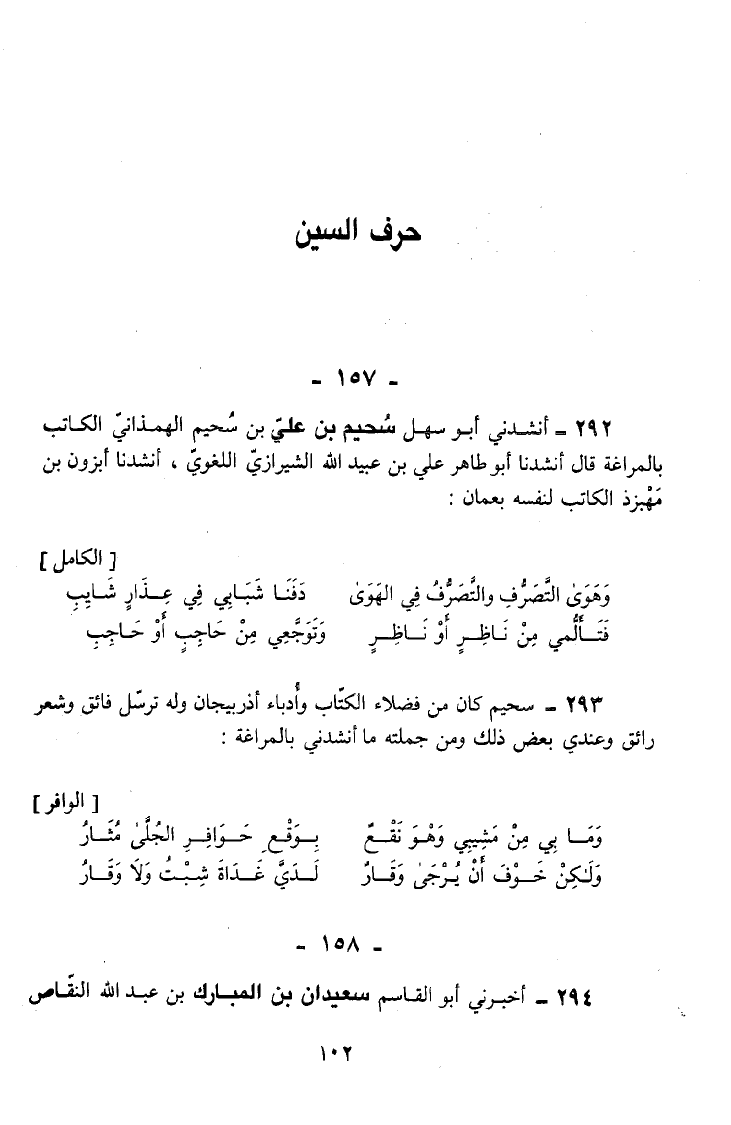 292 - أَنْشَدَنِي أَبُو سَهْلٍ سُحَيْمُ بْنُ عَلِيِّ بْنِ سُحَيْمٍ الْهَمَذَانِيُّ الْكَاتِبُ بِالْمَرَاغَةِ قَالَ أَنْشَدَنَا أَبُو طَاهِرٍ عَلِيُّ بْنُ عُبَيْدِ اللَّهِ الشِّيرَازِيُّ اللُّغَوِيُّ أَنْشَدَنَا أَبْزُونُ بْنُ مَهْبَزَذَ الْكَاتِبُ لِنَفْسِهِ بِعُمَانَ