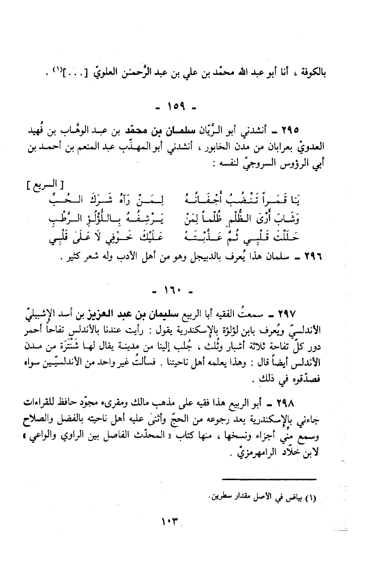 298 - أَبُو الرَّبِيعِ هَذَا فَقِيهٌ عَلَى مَذْهَبِ مَالِكٍ وَمُقْرِئٌ مُجَوِّدٌ حَافِظٌ لِلْقِرَاءَاتِ جَاءَنِي بِالْإِسْكَنْدَرِيَّةِ بَعْدَ رُجُوعِهِ مِنَ الْحَجِّ وَأَثْنَى عَلَيْهِ أَهْلُ نَاحِيَتِهِ بِالْفَضْلِ وَالصَّلَاحِ وَسَمِعَ مِنِّي أَجْزَاءٌ وَنَسَخَهَا مِنْهَا كتاب الْمُحدث الْفَاصِل بَين الرَّاوِي والواعي لِابْنِ خَلاد الرامَهُرْمُزِي