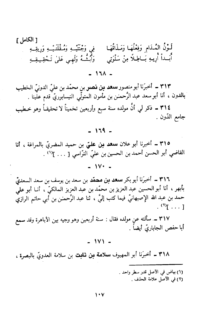 313 - أخبرنَا أَبُو مَنْصُورٍ سَعْدُ بْنُ نَصْرِ بْنِ مُحَمَّدِ بْنِ عَلِيِّ الدُّونِيُّ الْخَطِيبُ بِالدُّونِ أَنَا أَبُو سَعْدٍ عَبْدُ الرَّحْمَنِ بْنُ مَأْمُونٍ الْمُتَولِّي النَّيْسَابُورِيُّ قَدِمَ عَلَيْنَا.