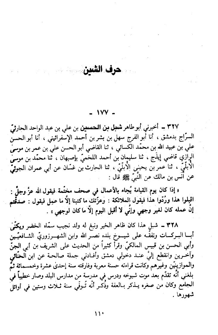 328 - شِبْلٌ هَذَا كَانَ ظَاهِرَ الْخَيْرِ وَنَبَغَ لَهُ وَلَدٌ نَجِيبٌ سَمَّاهُ الْخَضِرَ وَيُكَنَّى أَبَا الْبَرَكَاتِ وَتَفَقَّهَ عَلَى شُيُوخِ بَلَدِهِ نَصْرِ اللَّهِ وَابْنِ الشَّهْرَزُورِيِّ الشَّافِعِيِّينَ وَأَبِي الْحَسَنِ بْنِ قَبِيسٍ الْمَالِكِيِّ وَقَرَأَ كَثِيرًا مِنَ الْحَدِيثِ عَلَى الشَّرِيفِ بْنِ أَبِي الْجِنِّ وَآخَرِينَ وَانْقَطَعَ إِلَيَّ عِنْدَ دُخُولِي دِمَشْقَ وَأَفَادَنِي جُمْلَةً صَالِحَةً عَنِ ابْنِ الْحِنَّائِيِّ وَالْمَوَازِينِّينَ وَغَيْرِهِمْ وَكَانَتْ قِرَاءَتُهُ حَسَنَةً مُعْرَبَةً وَفَارَقْتُهُ سَنَةَ إِحْدَى عشرَة وَخَمْسمِائة ثُمَّ بَلَغَنِي أَنَّهُ تَقَدَّمَ بَعْدَ مَوْتِ شُيُوخِهِ وَدَرَّسَ فِي مَدْرَسَةٍ مِنْ مَدَارِسِ الْبَلَدِ وَصَارَ خَطِيبًا فِي الْجَامِعِ وَكَانَ مِنْ صِغَرِهِ يُذْكُرُ بِالْعِفَّةِ وَذُكِرَ أَنَّهُ تُوُفِّيَ سَنَةَ ثَلَاثٍ وَسِتِّينَ فِي أَوَائِلِ شُهُورِهَا.