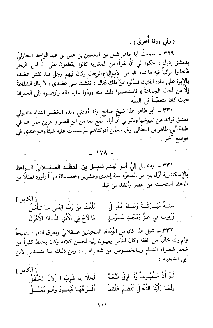 331 - وَدَخَلَ إِلَيَّ أَبُو الْهَيْثَمِ شِبْلُ بْنُ الْمُقَلِّدِ الْعَسْقَلَانِيُّ الْوَاعِظُ بِالْإِسْكَنْدَرِيَّةِ أَوَّلَ يَوْمٍ مِنَ الْمحرم سنة إِحْدَى وَعشْرين وَخَمْسمِائة مُهَنِّئًا وَأَوْرَدَ فَصْلًا مِنَ الْوَعْظِ اسْتَحْسَنَهُ مَنْ حَضَرَ وَأَنْشَدَ مِنْ قِبَلِهِ