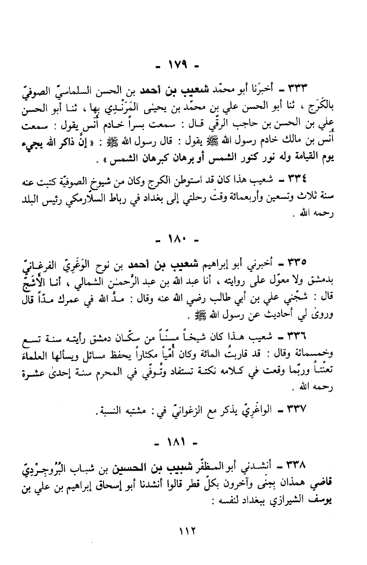 334 - شُعَيْبٌ هَذَا كَانَ قَدِ اسْتَوْطَنَ الْكَرَجَ وَكَانَ مِنْ شُيُوخِ الصُّوفِيَّةِ كَتَبْتُ عَنهُ سنة ثَلَاث وَتِسْعين وَأَرْبَعمِائَة وَقْتَ رِحْلَتِي إِلَى بَغْدَادَ فِي رِبَاطِ السَّلَّارَمْكِيِّ رَئِيسِ الْبَلَدِ رَحِمَهُ اللَّهُ.