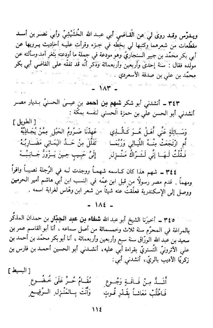 343 - أَنْشَدَنِي أَبُو شُكْرٍ شَهْمُ بْنُ أَحْمَدَ بْنِ عِيسَى الْحَسَنِيُّ بِدِيَارِ مِصْرَ أَنْشَدَنِي أَبُو الْحَسَنِ عَلِيُّ بْنُ حَمْزَةَ الْحَسَنِيُّ لِنَفْسِهِ بِمَكَّةَ