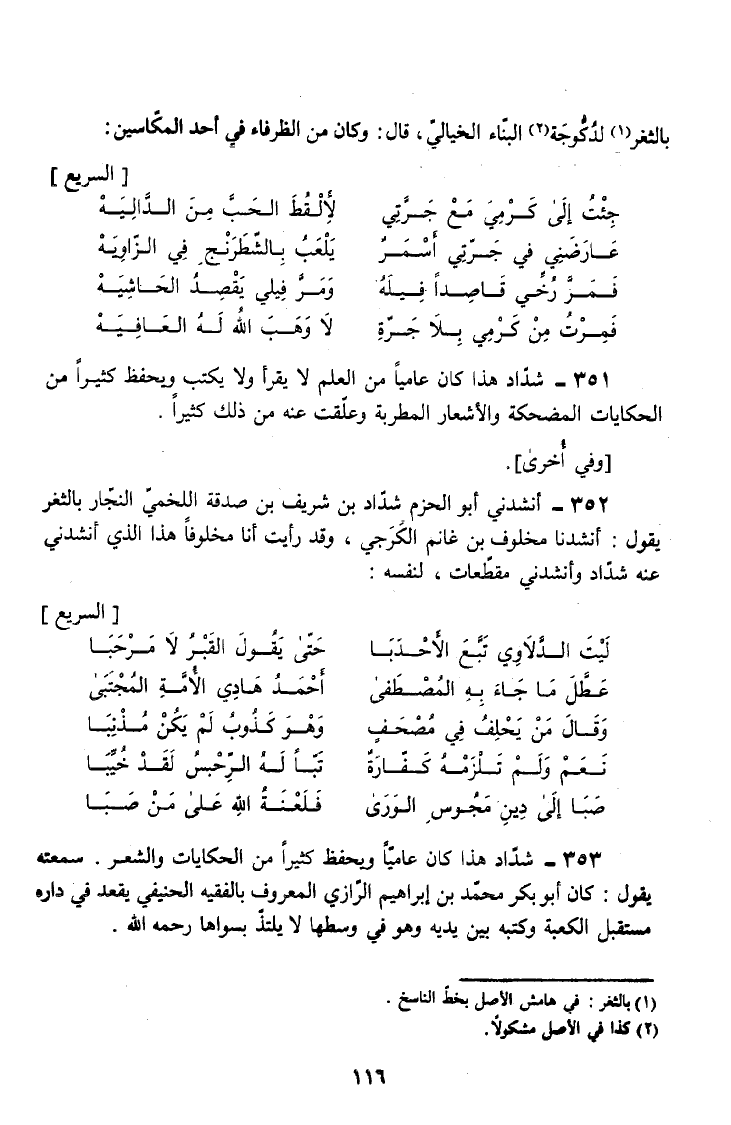 351 - شَدَّادٌ هَذَا كَانَ عَامِّيًّا مِنَ الْعِلْمِ لَا يَقْرَأُ وَلَا يَكْتُبُ وَيَحْفَظُ كَثِيرًا مِنَ الْحِكَايَاتِ الْمُضْحِكَةِ وَالْأَشْعَارِ الْمُطْرِبَةِ وَعَلَّقْتُ عَنْهُ مِنْ ذَلِكَ كَثِيرًا