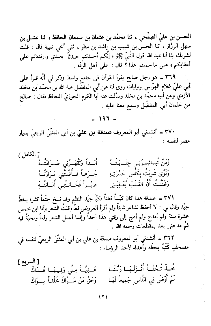 370 - أَنْشَدَنِي أَبُو الْمَعْرُوفِ صَدَقَةُ بْنُ عَلِيِّ بْنِ أَبِي الْمُثَنَّى الرَّبَعِيُّ بِدِيَارِ مِصْرَ لِنَفْسِهِ